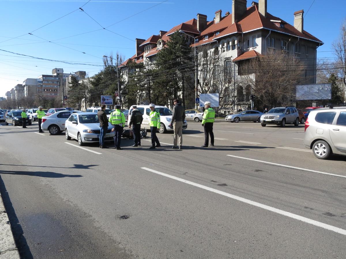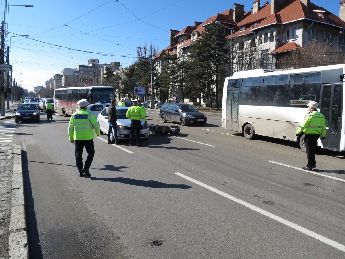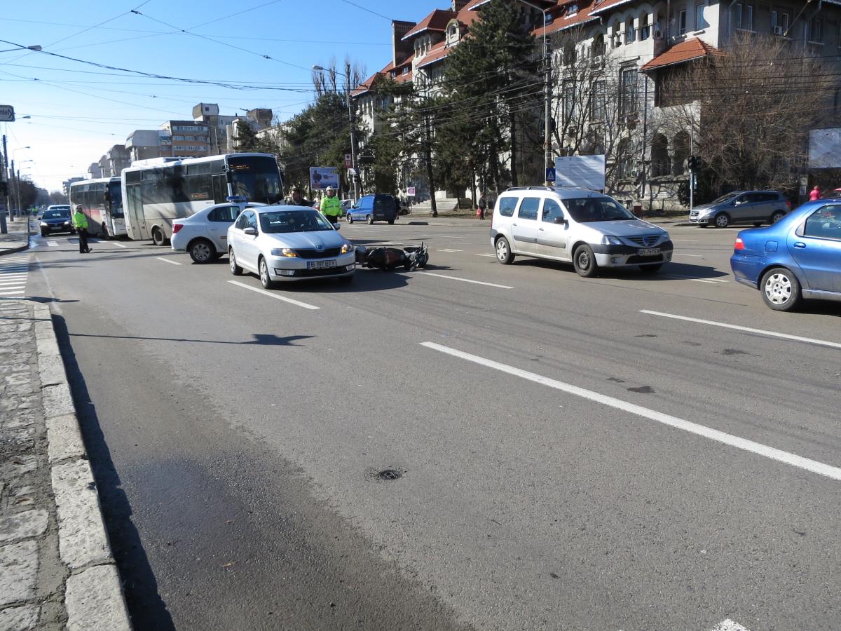 Un brăilean de 53 de ani care se deplasa pe scuter a fost izbit de o mașină, pe Calea Călărașilor, chiar în dreptul Primăriei. Vina aparține chiar celui care circula cu vehiculul pe două roți. Acesta circula pe Bulevardul Independenței și la intersecția cu Calea Călărașilor nu a acordat prioritate unui autoturism Skoda. Mașina venea dinspre strada Grivița și se îndreprta către Centru, fiind condusă de un bărbat de 31 de ani, din Constanța. Șoferul nu a reușit să îl evite pe scuterist și l-a izbit în plin, trântindu-l la pământ. Acesta a fost preluat de ambulanță și dus la spital.