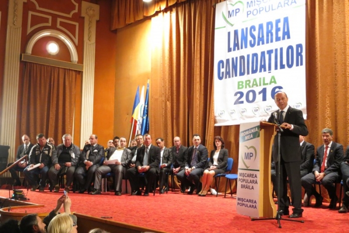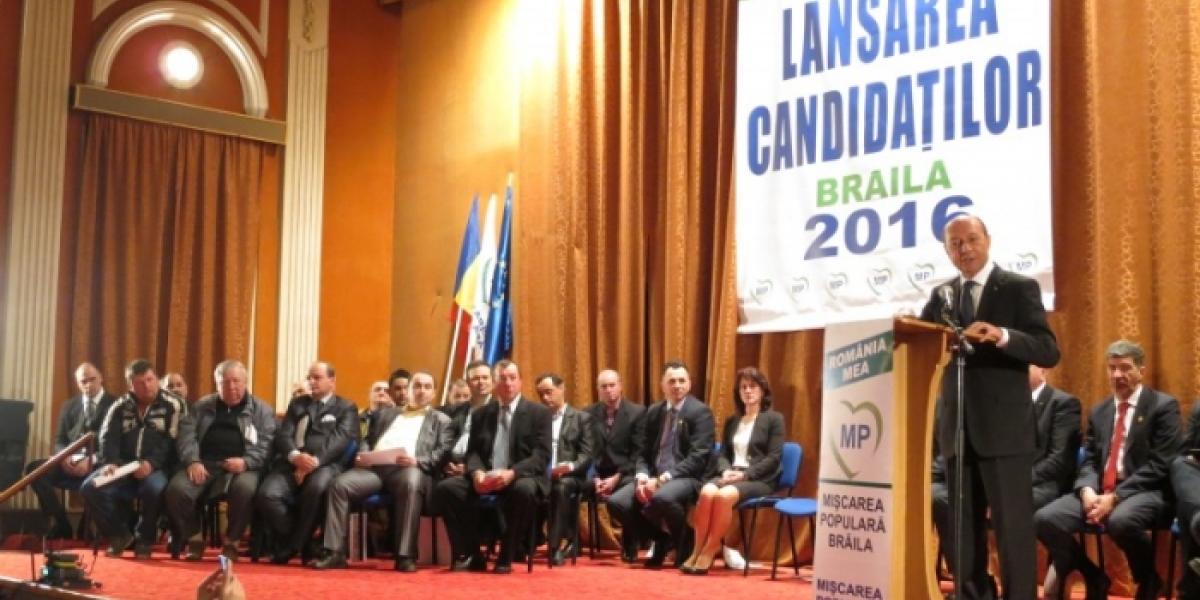 Fostul preşedinte al României, Traian Băsescu, a făcut, sâmbătă, o vizită în oraşul Brăila, pentru a lansa candidaţii PMP în cursa electorală din luna iunie. Băsescu a fost întâmpinat cu ropote de aplauze din partea brăilenilor, care au umplut până la refuz sala "Lyra", locul în care a fost organizat evenimentul.