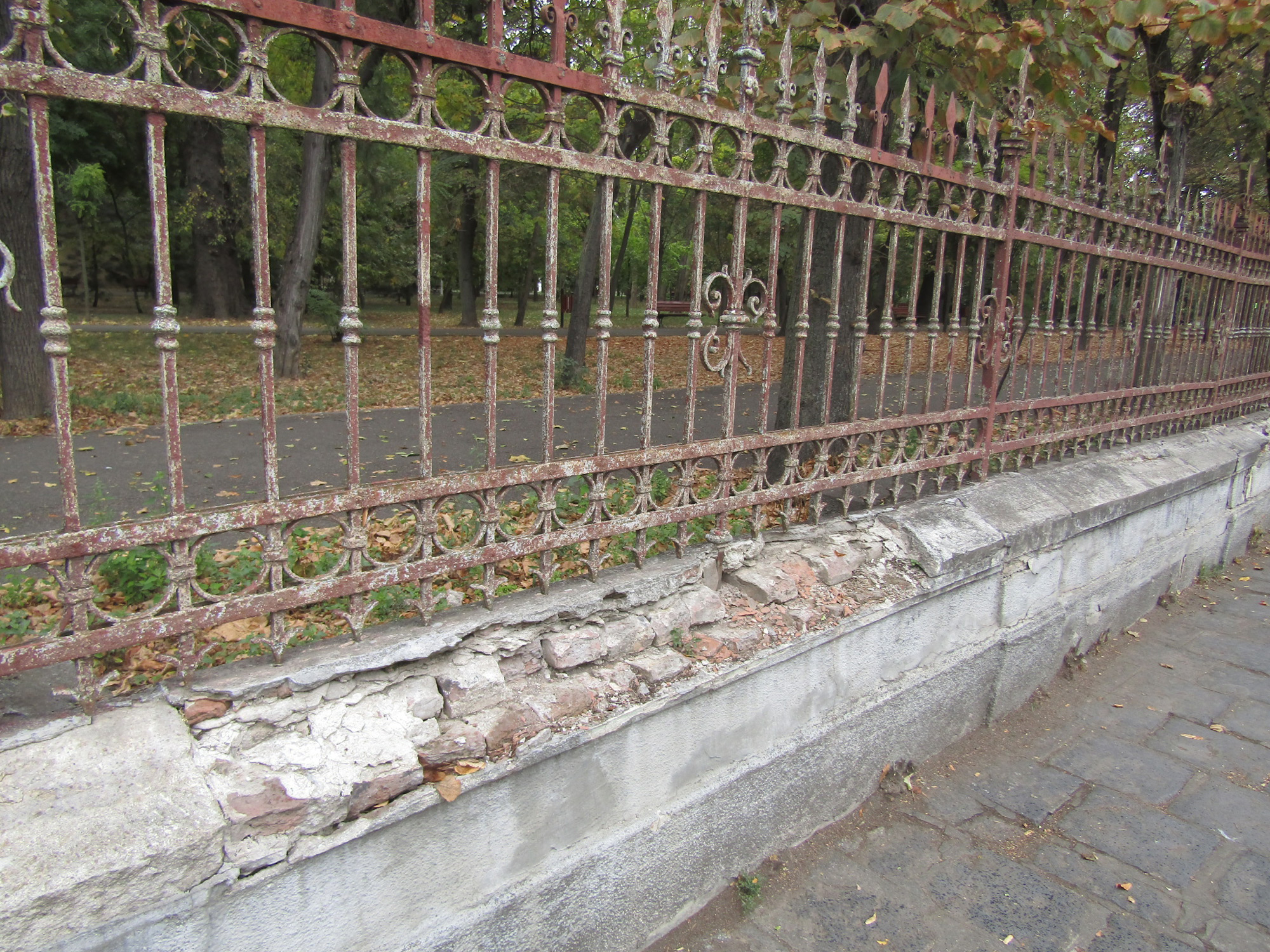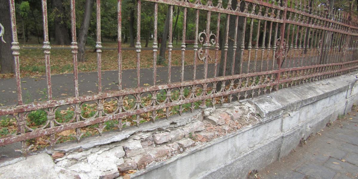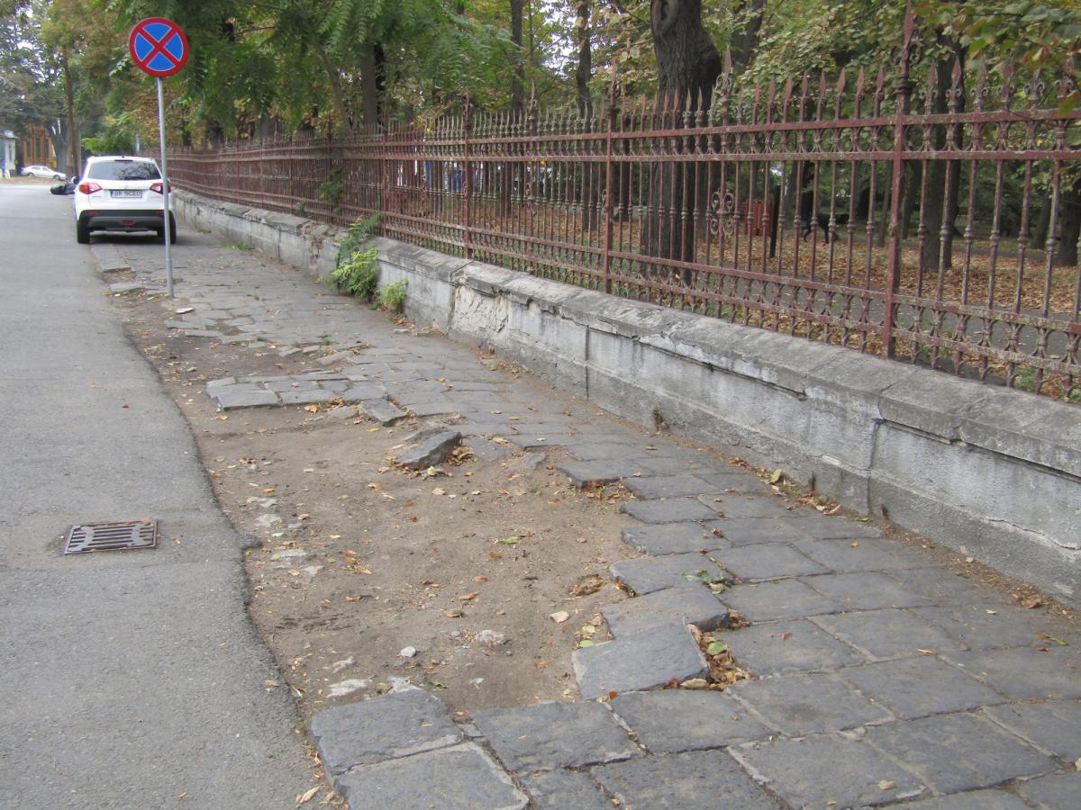 Ce se întâmplă cu acest gard: este într-o avansată stare de degradare, ba chiar înclinat spre latura dinspre benzinărie. Bucăți mari din tencuială, erodată de trecerea timpului și intemperii, alternează cu distrugerea trotuarului prin furtul de dale și gunoiul aruncat din belșug, acolo unde ar fi trebuit să existe o bordură. De fapt, gropi au apărut și în trotuarul de vizavi. Au dispărut și multe borduri, iar în interiorul grădinii, o canalizare distrusă și plină de gunoi se află la câțiva pași de soclul pe care stă bustul lui Mihail Sadoveanu, de ani de zile deteriorat și acesta. Apropo: în Grădina Publică nu s-ar putea găsi un loc și pentru un bust dedicat inegalabilului scriitor Fănuș Neagu, regele metaforei din literatura română? Ar fi o măsură reparatorie pentru memoria unei asemenea personalități a Brăilei!