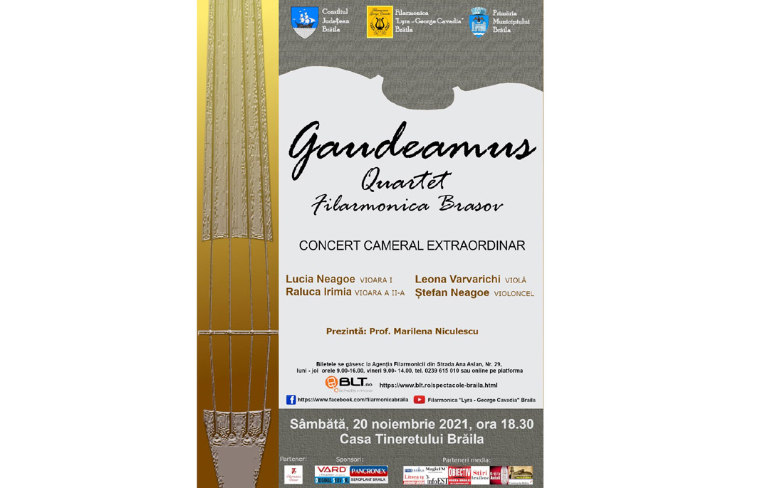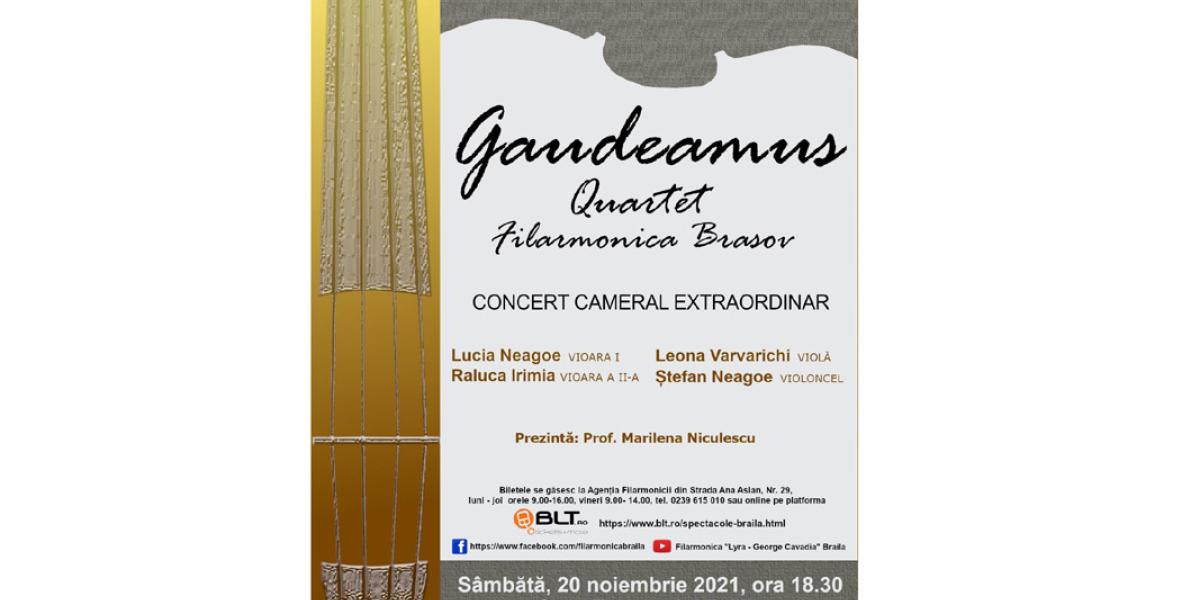 Cu o bogată experiență și o dedicare de 35 de ani în slujba Muzicii, Gaudeamus - Filarmonica Brașov poposește pe tărâmuri brăilene pentru a ne propune o cufundare în lumea artei sonore. Pe 20 noiembrie 2021, ora 18.30, Filarmonica "Lyra - George Cavadia" Brăila vă invită la un Concert cameral extraordinar la Casa Tineretului Brăila, în care veți avea onoarea de a îi cunoaște și de a-i asculta pe cei patru mesageri ai frumosului. Componența formației camerale s-a schimbat de-a lungul timpului ajungând în prezent la formula: Lucia Neagoe - vioara I, Raluca Irimia - vioara a II-a, Leona Varvarichi - violă și Ștefan Neagoe - violoncel.