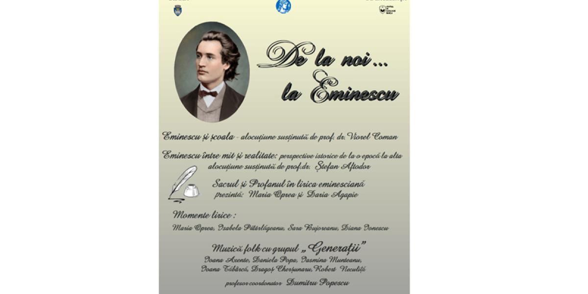 După cum a precizat managerul instituției, Emanoil Ciucașu, în cadrul manifestării culturale intitulate ”De la noi… la Eminescu”, binecunoscutul eminescolog brăilean prof. dr. Viorel Mortu va susține o alocuțiune pe tema ”Eminescu și școala”, prof. dr. Ștefan Aftodor, directorul Centrului Județean de Excelență Brăila, va vorbi despre Eminescu între mit și realitate: perspective istorice de la o epocă la alta, iar Maria Oprea și Agapie Daria, eleve ale Colegiului Național „Gheorge Munteanu Murgoci”, vor susține comunicarea ”Sacrul și profanul în lirica eminesciană”.