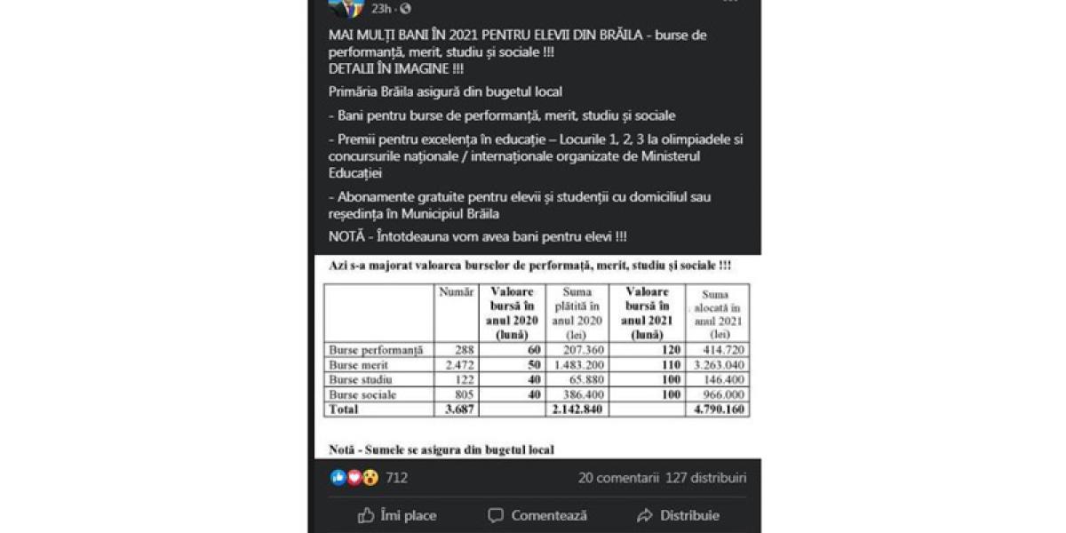 ”MAI MULȚI BANI ÎN 2021 PENTRU ELEVII DIN BRĂILA - burse de performanță, merit, studiu și sociale!!! Primăria Brăila asigură din bugetul local: Bani pentru burse de performanță, merit, studiu și sociale; Premii pentru excelența în educație – Locurile 1, 2, 3 la olimpiadele și concursurile naționale / internaționale organizate de Ministerul Educației; Abonamente gratuite pentru elevii și studenții cu domiciliul sau reședința în Municipiul Brăila. NOTĂ - întotdeauna vom avea bani pentru elevi!!!”, a declarat Dragomir, atașând o imagine cu schema alocărilor de bani de la bugetul local pentru bursele elevilor.