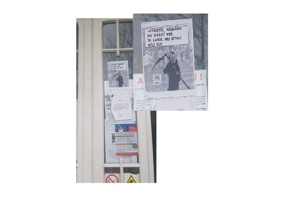O imagine macabră, lipită la avizierul Primăriei din comuna Viziru, a stârnit reacții critice, dar și de amuzament, după ce a ajuns să fie postată pe site-urile de socializare în această seară. Este vorba despre o fotografie printată în alb-negru pe o coală de hârtie A4, în care apare moartea cu coasa în prim-plan, iar pe fundal, o altă imagine cu oameni plimbându-se pe stradă. Aceasta este însoțită de mesajul: ”Atenție, români! Nu stați voi în casă, nu stau nici eu”!