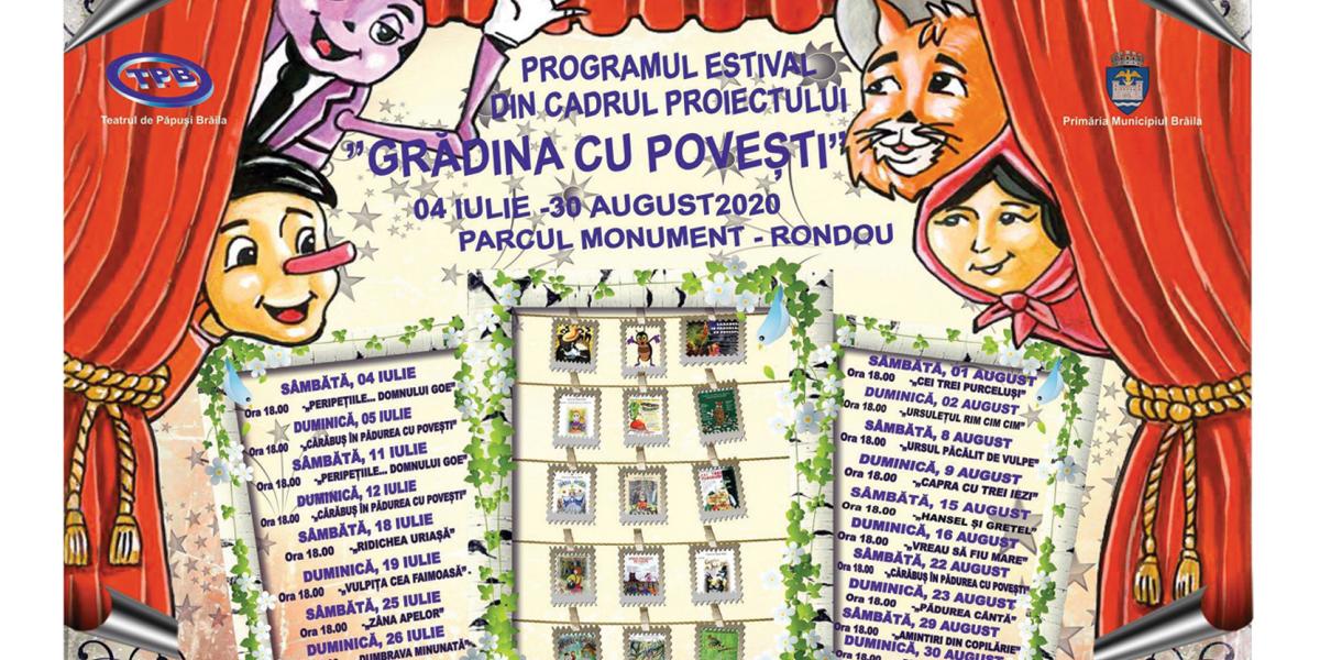 Începând de sâmbătă, 4 iulie, actorii Teatrului CĂRĂBUŞ din Brăila se vor reîntâlni cu publicul de toate vârstele la spectacole în aer liber. Locaţia desfăşurării spectacolelor este în Parcul Monument, la Rondou, începând cu ora 18:00, iar intrarea este liberă. Rezervarea locurilor se poate face la numărul de tel. 0787515344 de luni până vineri, între orele 8:00 - 16:00, în limita locurilor disponibile.