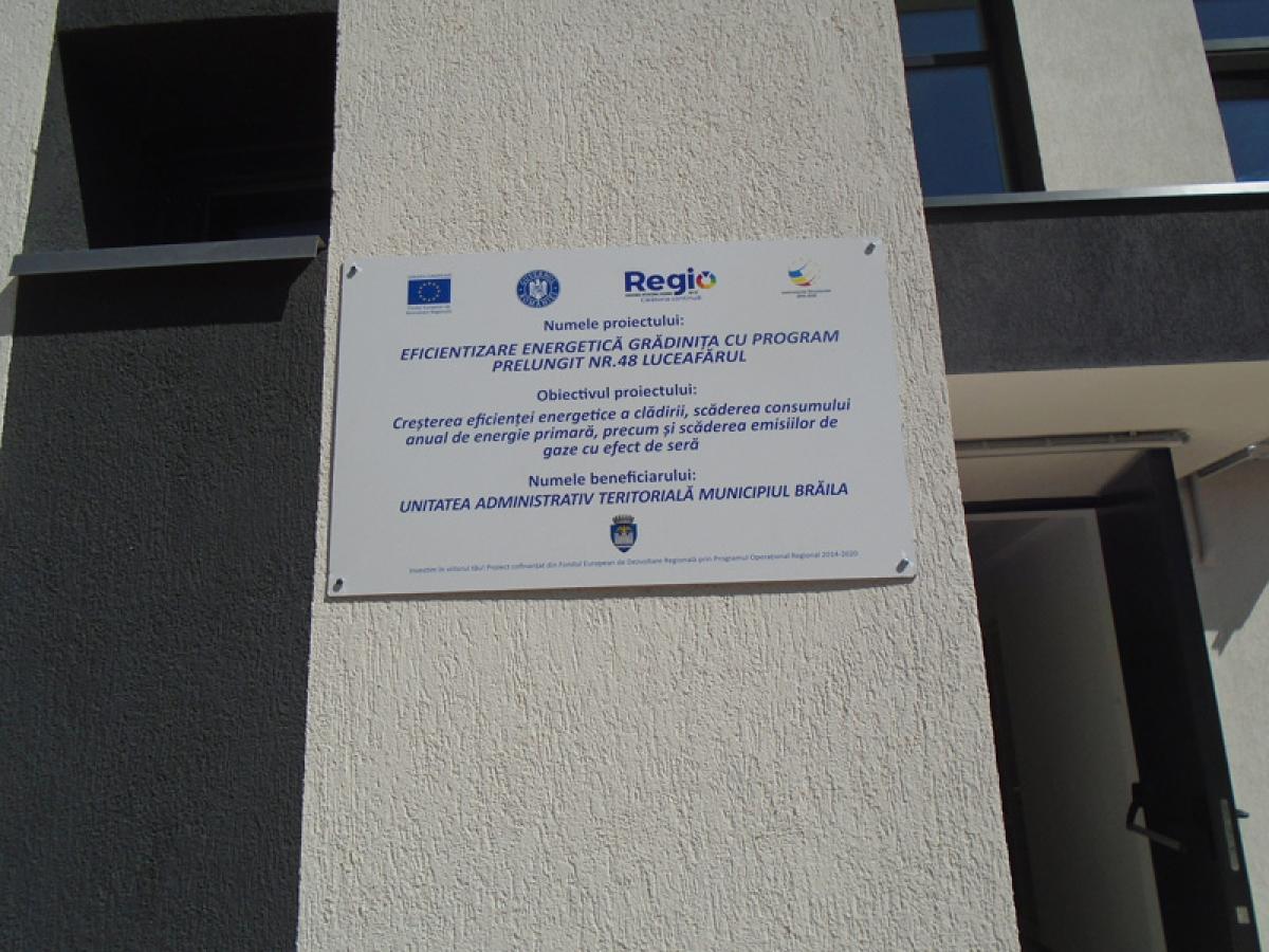 * implementat pe o perioadă de 66 de luni, proiectul "Eficientizarea energetică Grădinița cu program prelungit nr. 48 Luceafărul" a fost finanțat din fonduri nerambursabile, contribuție de la bugetul de stat și contribuția beneficiarului, respectiv Primăria Municipiului Brăila * municipalitatea va finanța, de asemenea, proiectele vizând înlocuirea mobilierului vechi și modernizarea curții instituției de învățământ