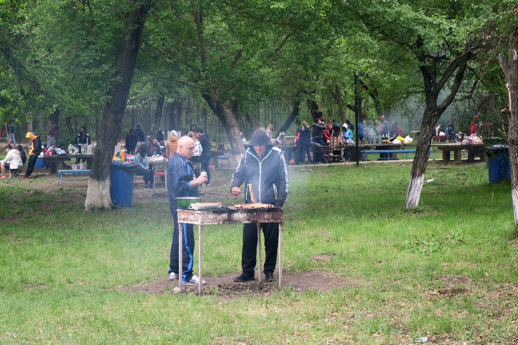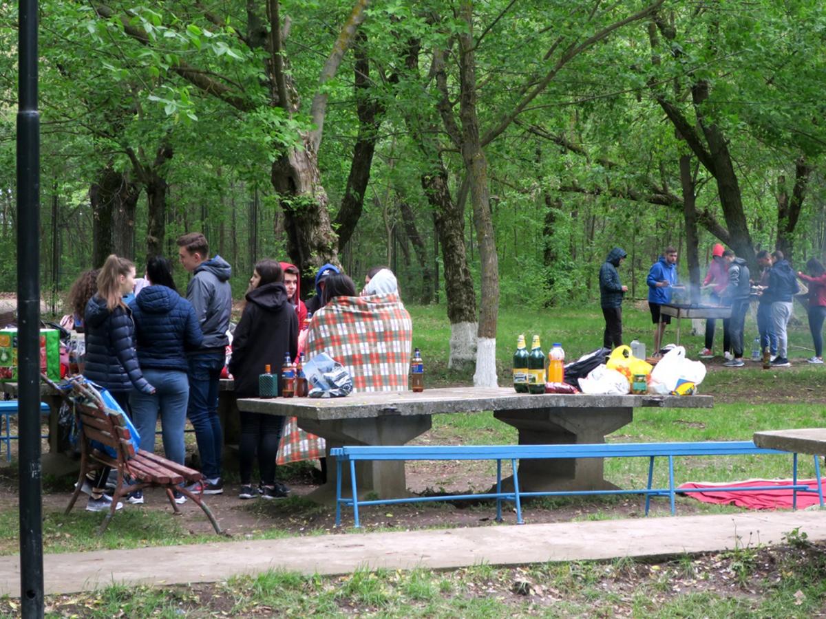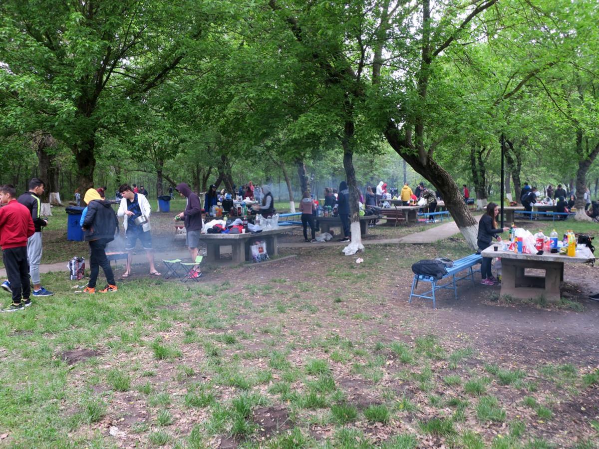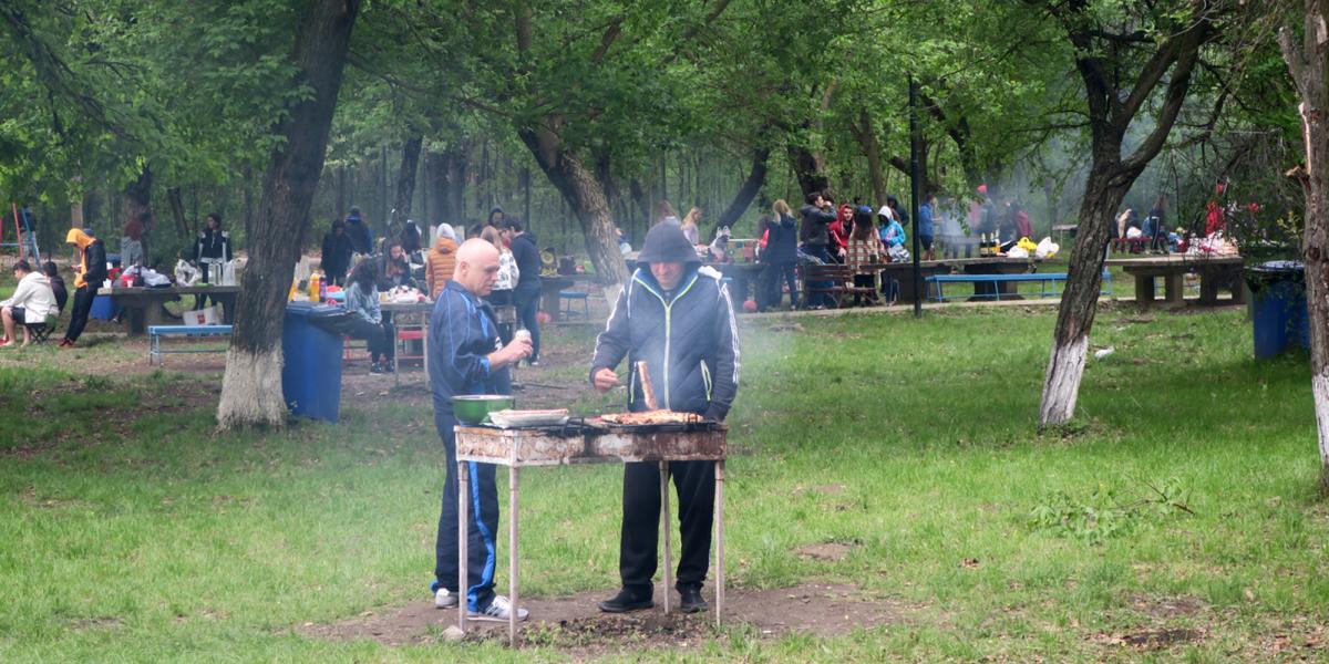 Nucleul dur al fanilor tradiţionalului grătar de 1 Mai nu s-a speriat de norii negri şi rafalele puternice de vânt. Aşa se face că, în jurul orei 11.00, circa 100 de persoane se aflau în tabăra din staţiunea Lacu Sărat, singurul loc amenajat legal pentru picnic din zona Brăilei. Mulţi s-au apucat de treabă imediat cum au ajuns, aprinzând focul şi pregătind tot ce era de pus pe masă, ca să fie siguri că reuşesc să îşi mănânce micii şi fripturile până începe ploaia. Pătrunse de frig, câteva fete mai sensibile se înfăşuraseră cu păturile pe care, în mod normal, ar fi trebuit să se aşeze la picnic. Chiar şi aşa, însă, toată lumea încerca să se distreze fără să ţină cont de vremea potrivnică. Aşa cum e moda de câţiva ani încoace, fiecare grup avea boxa lui şi muzica lui, iar ritmurile se amestecau printre copaci, într-o dezarmonie totală. Unii tineri încercau să îşi demonstreze talentele muzicale, în concursuri de karaoke făcute ad-hoc, ca să treacă timpul mai uşor până se prepara friptura de pe grătar.