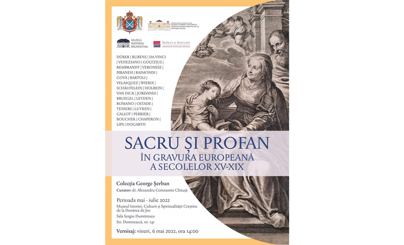 * vineri, 6 mai, ora 14.00, la Muzeul Istoriei, Culturii și Spiritualității Creștine de la Dunărea de Jos va fi vernisată expoziția "Sacru și Profan în gravura europeană a secolelor XV-XIX" * sunt expuse 100 de lucrări grafice realizate de cei mai cunoscuți artiști ai lumii: Rembrandt, Durer, Rubens, Da Vinci, Titian, Piranesi, Van Dyck, Teniers, Veronese, Goltzius, Goya, Velasquez * expoziția poate fi vizitată de marți până sâmbătă, între 9.00 și 17.00 * lucrările fac parte din colecția particulară a avocatului George Șerban