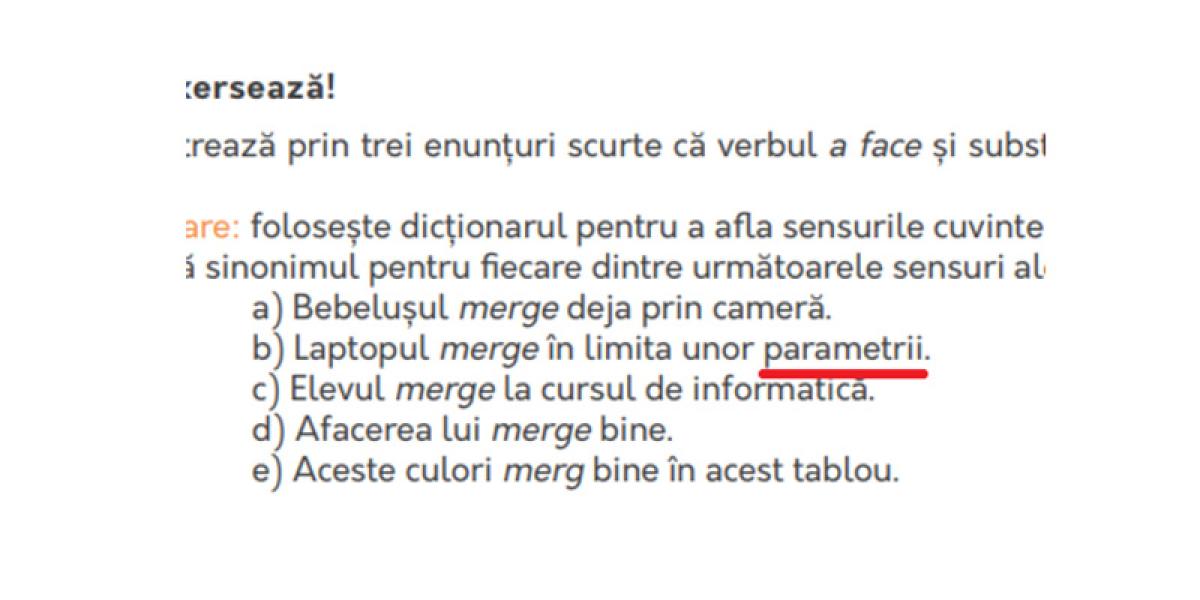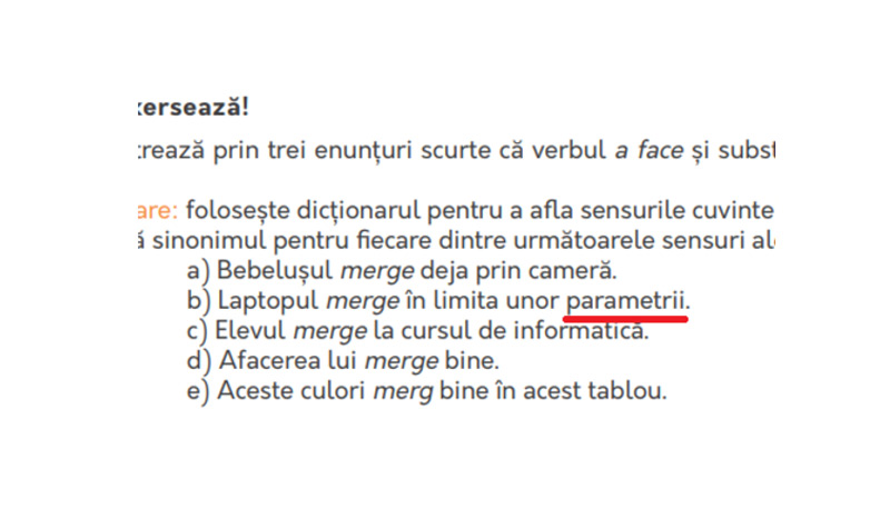 O altă greşeală din manual a fost semnalată de cei de la dexonline, la unul dintre exerciţii cuvântul “parametri” fiind scris cu doi de “i”: “parametrii.
