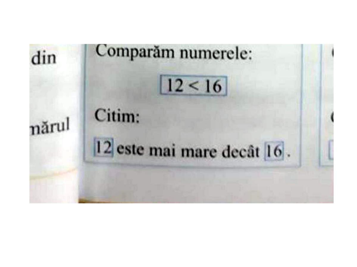 Nici măcar manualele copiilor din învăţământul primar nu au scăpat de greşeli. Spre exemplu, în manualul de Matematică şi Explorarea Mediului pentru clasa I, elevii învaţă că “12 este mai mare decât 16”.
