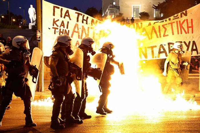 Pe toată durata dezbaterilor, în exteriorul Parlamentului, zeci de mii de oameni au manifestat împotriva planului de austeritate. Sticle incendiare aruncate, mobilier urban distrus, vitrine sparte au dus la împrăştierea unei manifestaţii de aproape 12.000 de opozanţi ai reformelor, după o zi marcată de prima grevă a funcţionarilor de la preluarea puterii de către Syriza. Mai mulţi poliţişti şi doi fotoreporteri ai agenţiei France Presse au fost răniţi uşor în aceste incidente, iar peste 40 de tineri au fost arestaţi.