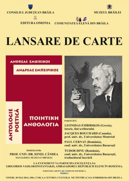 Cartea bilingvă română - greacă, "Antologie poetică", semnată de Andreas Embirikos, scriitor de origine greacă, născut la Brăila, va fi lansată mâine, de la ora 17.00, la Centrul Cultural "Nicăpetre". Invitat de onoare al evenimentului este Excelenţa Sa Grigorios Vasilokonstantakis, ambasadorul Republicii Elene în România, alături de: Leonidas Embirikos din Grecia, istoric, fiul scriitorului, prof. univ. dr. Jacques Bouchard de la Universitatea Montréal din Canada, conf. univ. dr. Paul Cernat de la Universitatea Bucureşti, conf. univ. dr. Tudor Dinu tot de la Universitatea Bucureşti, traducătorul lucrării. Evenimentul va fi moderat de prof. univ. dr. Ionel Cândea, managerul Muzeului Brăilei.