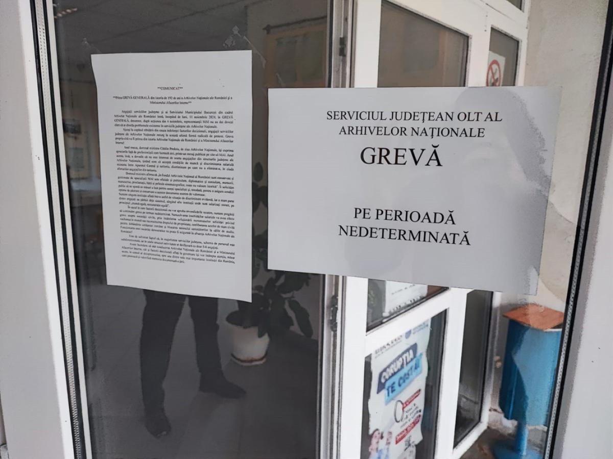 • de astăzi, 11 noiembrie, salariații Serviciului Județean Brăila al Arhivelor Naționale (SJAN) au intrat în grevă generală, solidarizându-se, astfel, cu arhiviștii din toată țara • este prima grevă generală din istoria de 192 de ani a Arhivelor Naționale și a Ministerului de Interne din România • „De la data declanșării grevei de avertisment, pe 4.11 2024, conducerea Arhivelor Naționale ori un reprezentant al Ministerului de Interne nu și-a arătat interesul față de revendicările noastre”, a precizat Ștefania Botez, consilier superior în cadrul SJAN Brăila