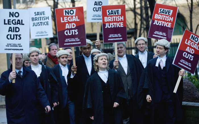Ei au manifestat pentru a denunţa intenţia Guvernului premierului conservator David Cameron de a reduce până în 2018-2019 cu 220 de milioane de lire sterline (265 milioane de euro) bugetul pentru ajutorul jurisdicţional. Acesta se ridică la două miliarde de lire sterline şi finanţează asistenţa juridică pentru persoanele care nu-şi pot finanţa apărarea.