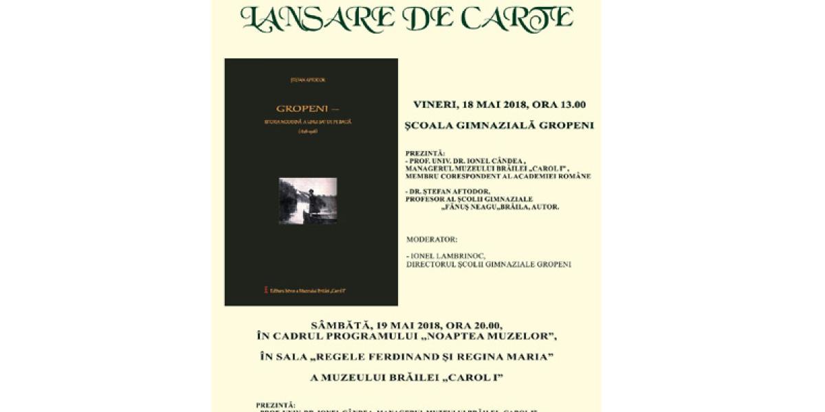 Astăzi, 18 mai 2018, ora 13,00, la Şcoala Gimanzială Gropeni are loc lansarea cărţii “Gropeni-istoria modernă a unui sat de baltă (1828-1918)”, autor Ştefan Aftodor, apărută la Editura Istros a Muzeului Brăilei “Carol I” anul acesta.