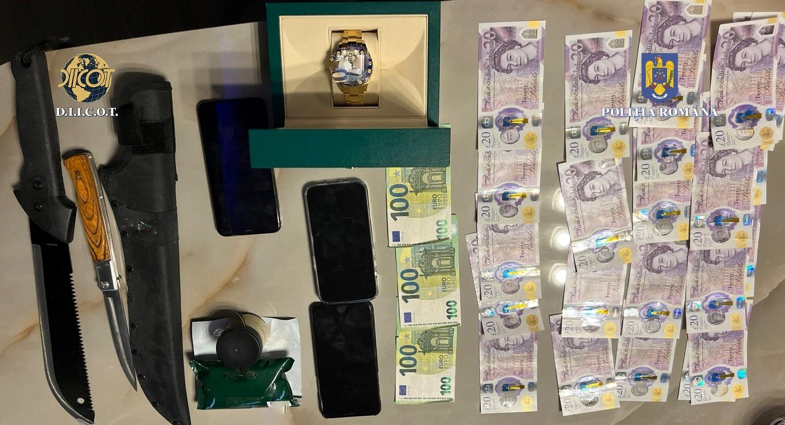 În urma percheziţiilor domiciliare au fost descoperite şi ridicate în vederea indisponibilizării sumele de 136.300 de euro şi 400 de lire, un ceas de lux, estimat la aproximativ 60.000 de euro, un pistol cu bile de cauciuc, 3 cuţite, 32 de cartuşe, adeverinţe şi reţete medicale ştampilate şi semnate în alb, 12 telefoane mobile, un laptop, 2 tablete şi 4 stick-uri de memorie. Au fost ridicate 4 autovehicule, dintre care 3 autoturisme de lux, în valoare totală de aproximativ 350.000 de euro, fiind aplicate sechestre asiguratorii asupra a patru proprietăţi imobiliare, respectiv o vilă de lux, două apartamente, situate într-un complex rezidenţial şi un spaţiu comercial, cu o valoare de aproximativ 1.000.000 euro.