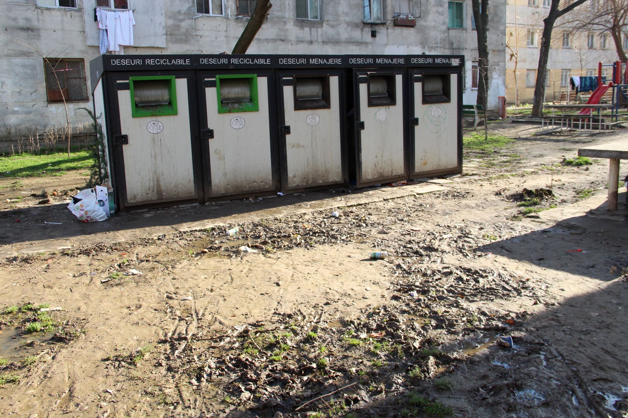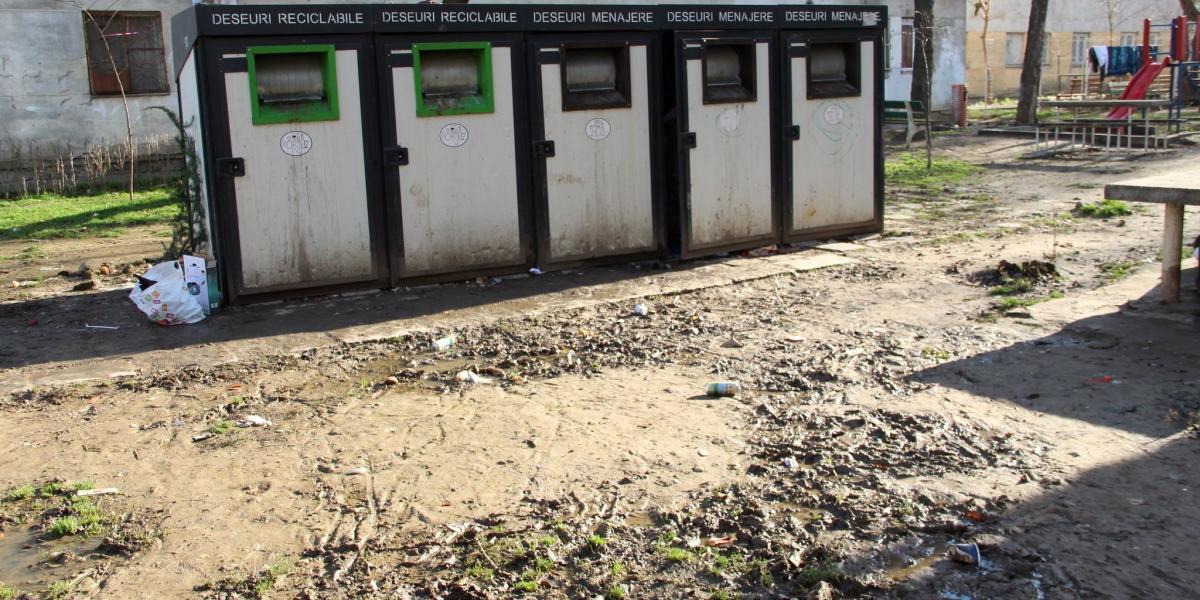 * locatarii blocurilor din zonă se plâng că tomberoanele dintr-un așa-zis modul pentru colectarea selectivă a deșeurilor au ajuns un adevărat focar de infecție * în plus, acestea sunt amplasate pe un teren neamenajat, unde se fac noroaie până la gleznă, după fiecare ploaie