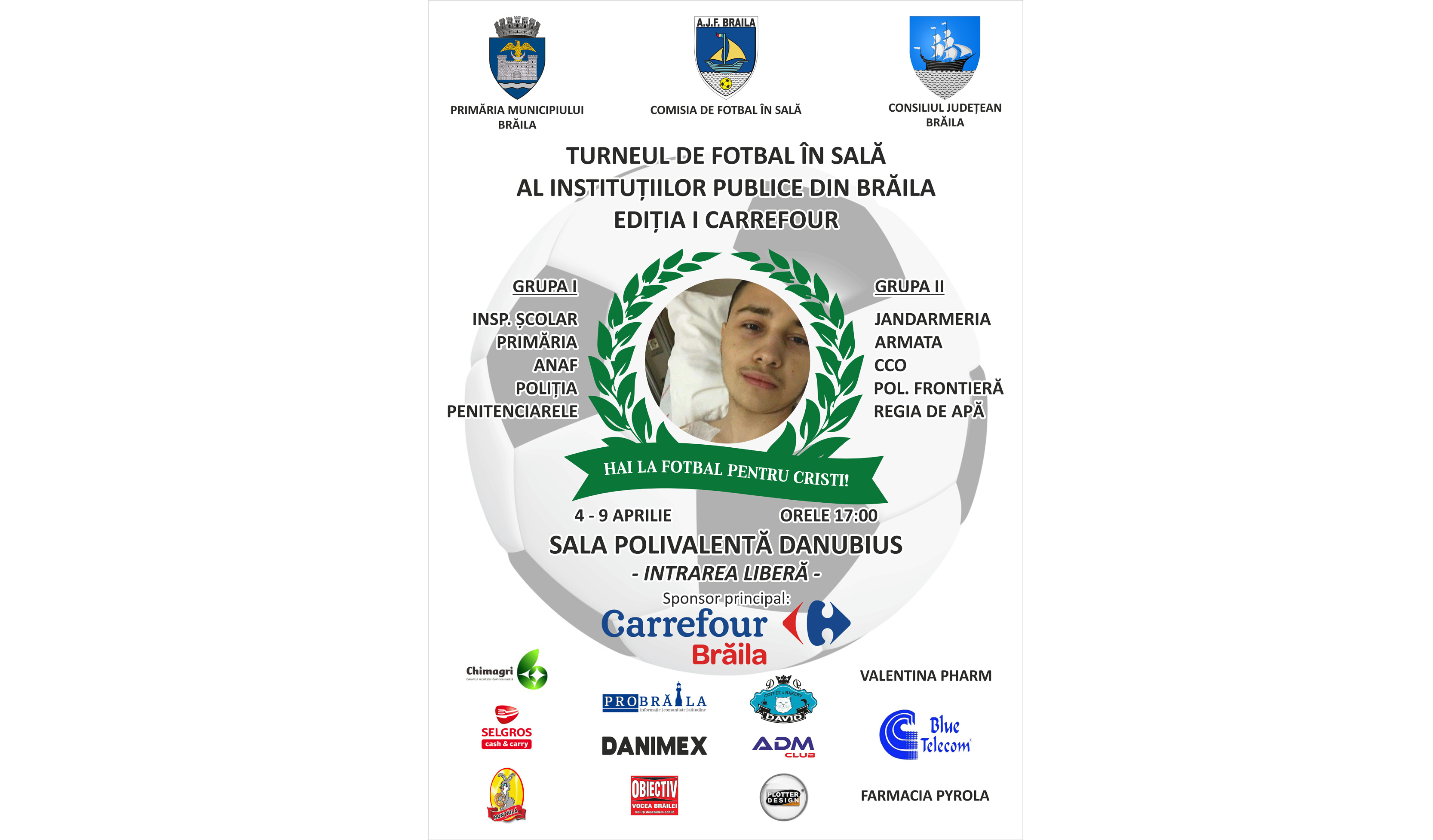 “Turneul de fotbal în sală al instituţiilor” este o competiţie caritabilă şi se desfăşoară sub deviza “Hai la fotbal pentru Cristi”. Este vorba despre Cristian Filip, adolescentul brăilean care este internat la clinica Acibadem din Turcia, unde urmează şedinţe de radioterapie şi chimioterapie, iar tratamentul său se ridică la 23.500 euro.