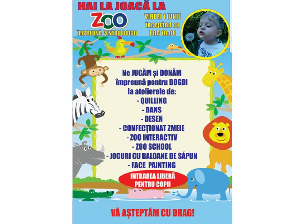 Sub sloganul “Hai la joacă pentru Bogdi!” şi cu motto-ul: “ne jucăm, ne distrăm şi donăm”, în Grădina Zoo veţi putea petrece o zi de poveste. Programul începe de la ora 10.00 şi se va încheia seara, cu o bine meritată mini-discotecă pentru copii şi spectacol de lasere. Face painting, ateliere de quilling şi dans, poze la minut, întâlniri cu personaje din poveşti - sunt doar câteva dintre surprizele ce îi aşteaptă pe copilaşi la Zoo. În Parcul Monument, evenimentul va începe la ora 10.00 şi se va termina în jurul orei 12.30-13.00. Să nu vă speriaţi că parcarea Kiselef (cea vizavi de fostul Liceu de Chimie) va fi plină de poliţişti şi jandarmi. Ei vor fi acolo pentru că au pregătit mai multe activităţi distractive. Practic, şi aici ne jucăm şi donăm pentru Bogdi!