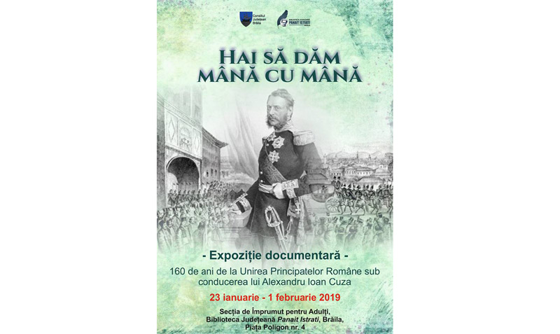 Biblioteca Judeţeană “Panait Istrati” Brăila marchează împlinirea a 160 de ani de la Unirea Principatelor Române prin organizarea unei expoziţii documentare intitulată “Hai să dăm mână cu mână”. Amplasată la parterul Secţiei Împrumut Adulţi, expoziţia poate fi vizitată până pe data de 1 februarie a.c.