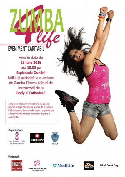 Asociaţia "Mame Independente", în parteneriat cu Primăria Municipiului Brăila, organizează prima ediţie a evenimentului "ZUMBA 4 LIFE" ce va avea loc sâmbătă, 23 iulie, pe scena de pe Esplanada Dunării, începând cu orele 10.00.