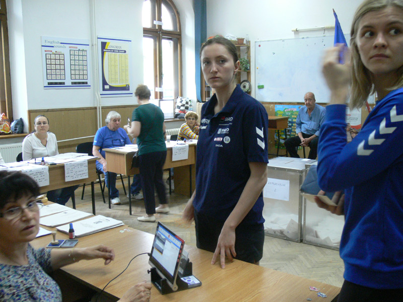 Prima selecţionată a ţării noastre a efectuat dimineaţă un antrenament la Sala Polivalentă sub comanda antrenorilor Tomas Ryde şi Costică Buceschi, au ajuns înapoi la hotel la ora 12.00, apoi şi-au exercitat dreptul constituţional de vot. Toate componentele lotului şi staff-ul tehnic, mai precis 26 de persoane, au votat la “Murgoci”. Bineînţeles că printre tricolore s-au aflat Alina Vătu, golgetera echipei HC Dunărea şi a Ligii Florilor, brăileanca Gabriela Perianu, recent transferată la CSM Bucureşti, dar şi alte handbaliste valoroase care au fost convocate pentru Trofeul Carpaţi, precum Crina Pintea, Denisa Dedu sau Mădălina Zamfirescu.