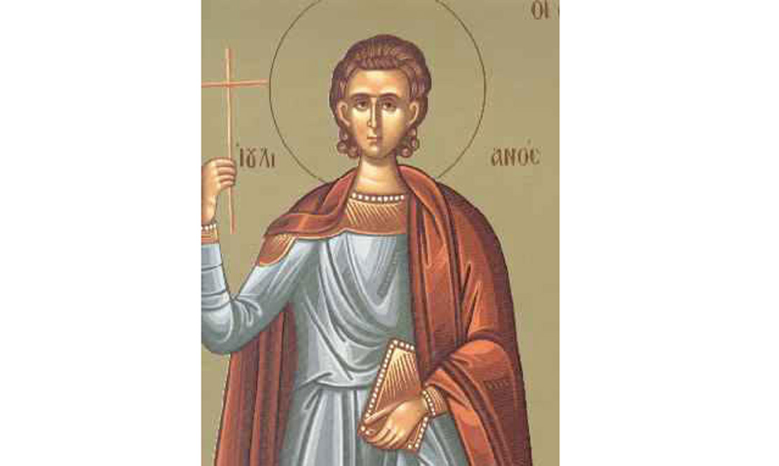 Sfântul Mucenic Iulian s-a născut într-o familie de aristocraţi din Tarsul Ciliciei şi a trăit pe vremea împăratului roman păgân Diocleţian. Iulian a primit moarte de mucenic când era în vârstă de 18 ani, pe vremea persecuţiei împotriva creştinilor. Călăii păgâni l-au torturat timp de un an, încercând să-l facă să se lepede de credinţa în Domnul Iisus Hristos. Aceştia au arestat-o şi pe mama lui Iulian, silind-o să-şi convingă fiul să se lepede de Hristos; ea însă l-a sfătuit să meargă la moarte cu mulţumire, cu nădejde şi cu bucurie. Sfântul Mucenic Iulian a fost legat într-un sac plin cu şerpi veninoşi, pe care l-au aruncat apoi în mare.