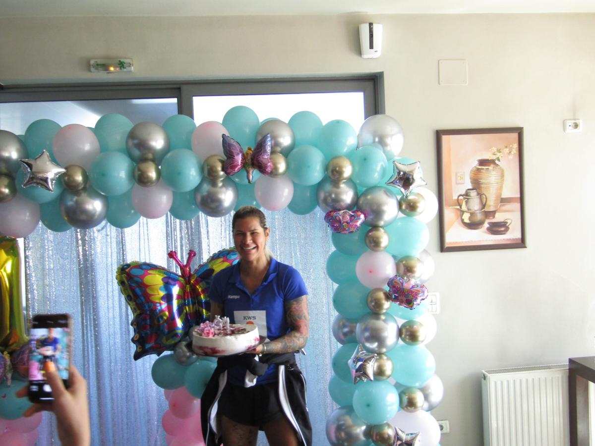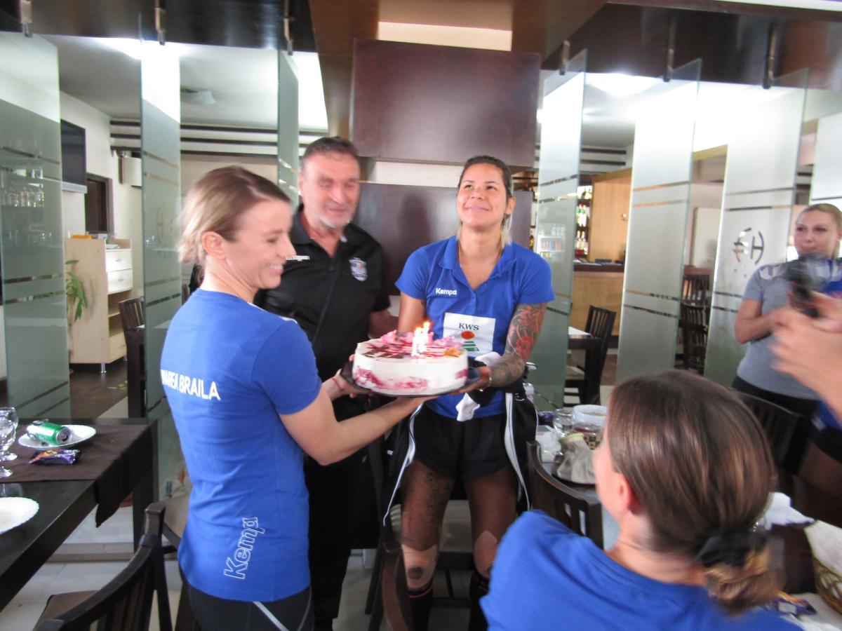 Imediat după încheierea meciului, jucătoarele și staff-ul tehnic și de conducere au revenit la hotel pentru masa de prânz și chiar după primul fel, pe fondul unei melodii braziliene, căpitanul de echipă Aneta Udriștoiu împreună cu vicepreședintele Marian Neta și directorul tehnic, Sorinel Meca, i-au oferit Myssei Pessoa un tort. Cu toate că a fost luată prin surprindere, pentru că despre acest cadou, doar persoanele menționate au știut, Pessoa și-a stăpânit emoțiile, așa cum a făcut-o și în timpul meciului când a apărat de două ori lovituri de la 7 metri și a cântat alături de colegele din echipă și s-a pozat cu acestea.