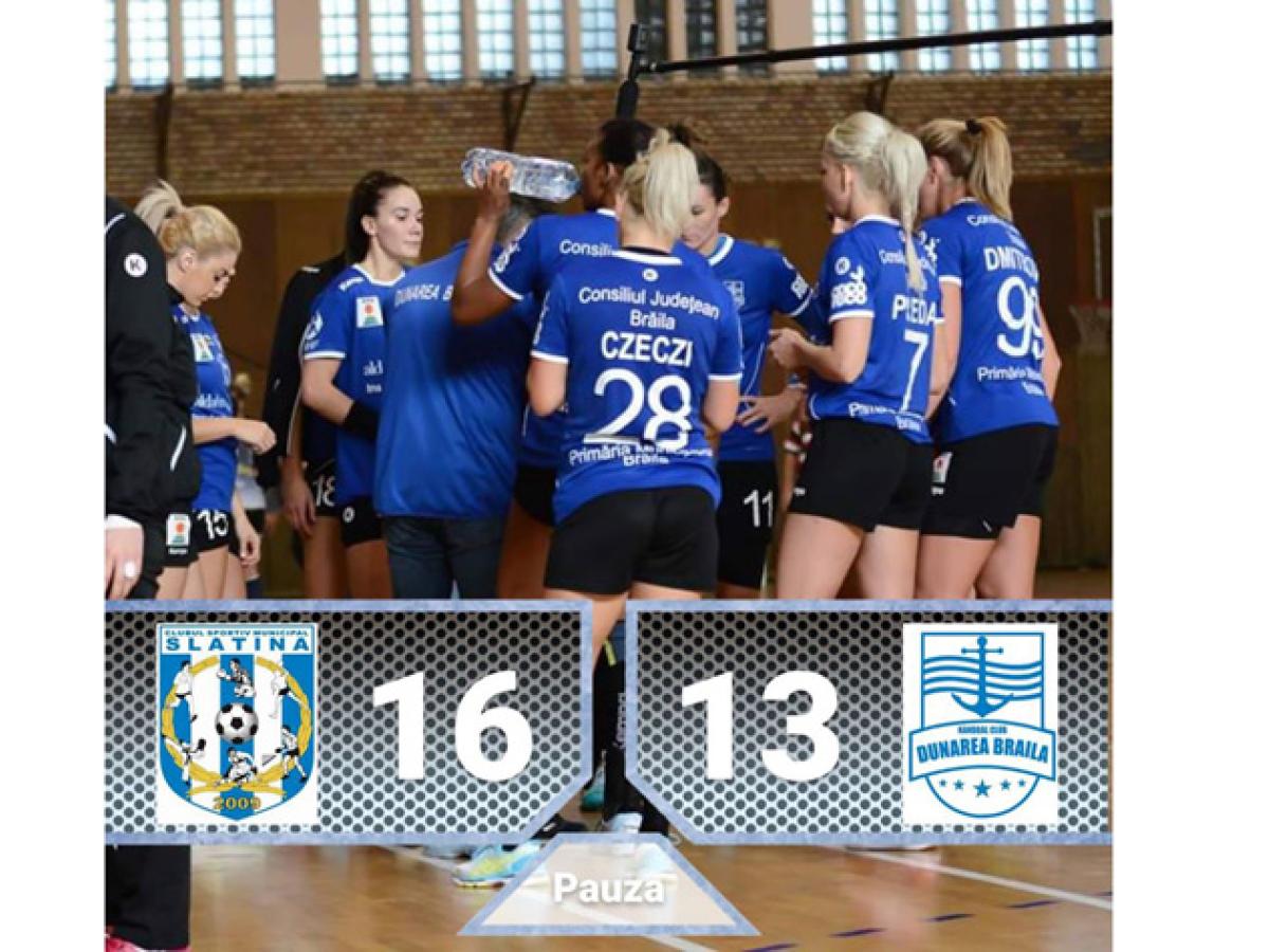 Oltencele au condus cu 2-0 însă după două ratări Dmitrovic a reuşit să înscrie, iar decalajul era de doar un gol între cele două formaţii. CSM Slatina a avut o evoluţie foarte bună şi în două rânduri a condus la o diferenţă de 6 goluri, 9-3 şi 10-4 în minutul 12. Însă treptat, coordonată de pe margine de antrenorul Neven Hrupec, HC Dunărea a început cursa de urmărire pentru a restabili egalitatea. Formaţia brăileană a reuşit să înscrie de patru ori la rând prin Tiron, Dmitrovic, Udriştoiu, Krnic şi de la 13-8, în minutul 23, CSM Slatina mai avea doar un singur gol avans pe tabelă, 13-12. A fost momentul în care echipa brăileană a demonstrat că are potenţial să întoarcă rezultatul în favoarea sa. A fost 14-13 pentru oltence în minutul 26, dar CSM Slatina a reuşit să plece la cabine cu un avans de trei lungimi, 16-13.