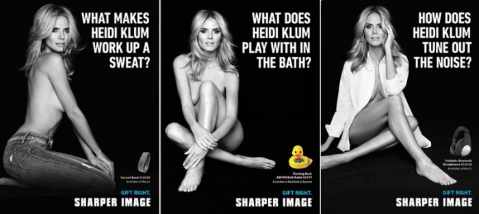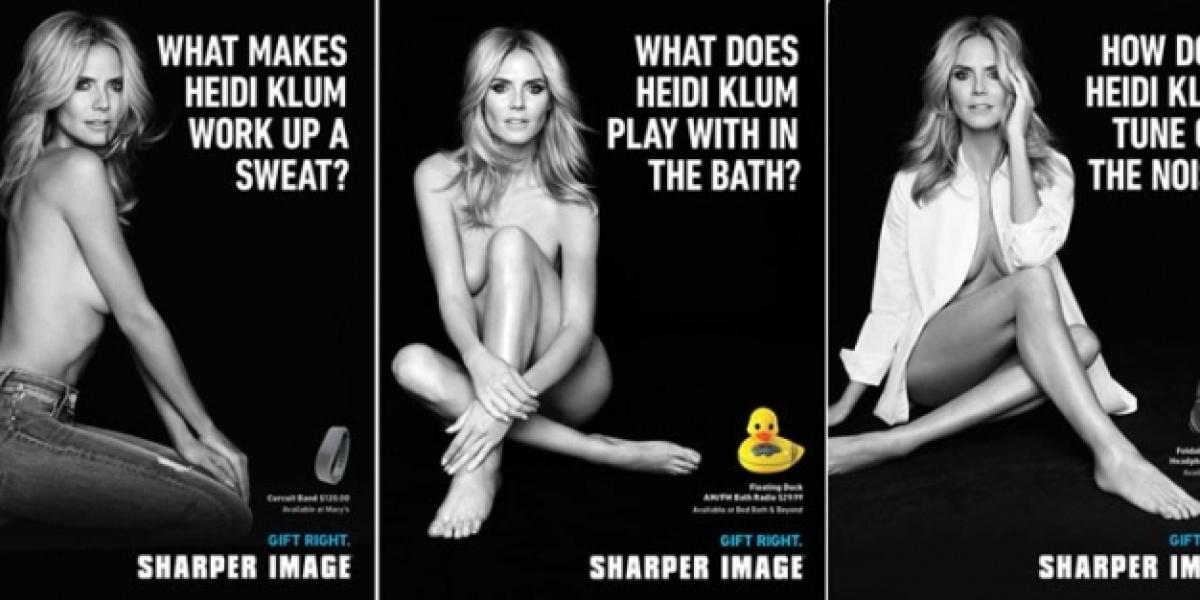 Reclamele, care prezintă unele dintre cele mai populare produse ale brandului de produse electronice Sharper Image, conţin imagini în care Heidi Klum, în vârstă de 41 de ani, apare sumar îmbrăcată sau chiar goală, alături de sloganuri cu tentă sexuală, precum "Ce-o ţine ocupată, la duş, pe Heidi Klum?" ("What keeps Heidi Klum busy in the shower?") şi "Ce o stârneşte pe Heidi Klum?" ("What turns Heidi Klum on?"), informează dailymail.co.uk.