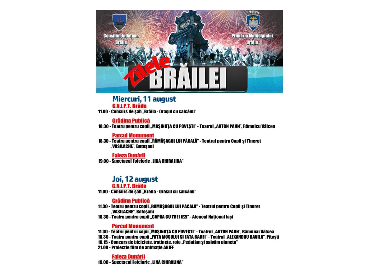 Miercuri, 11 august, vor avea loc o serie de evenimente interesante: La CNIPT Brăila se va desfășura un concurs de șah (ora 11:00), de la 18:30 spectacole de teatru pentru copii în Grădina Publică și în Parcul Monument, precum și spectacolul folcloric ”Lină Chiralină” pe Faleza Dunării de la ora 19:00.