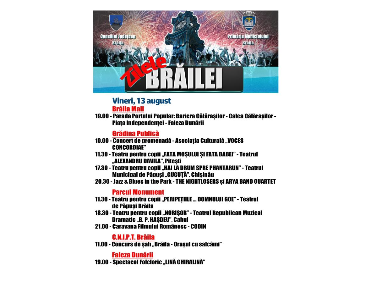 Vineri, 13 august, continuă concursurile de șah de dimineață, în Grădina Publică va avea loc un concert de promenadă - Asociația Culturală ”Voces Concordiae” de la ora 10:00, de asemenea spectacole de teatru pentru copii pe parcursul zilei și la ora 20:30 - Jazz and Blues în the Park - The Nightlosers și Arya Band Quartet. În Parcul Monument la fel ca în celelalte zile se vor pune în scenă spectacole de teatru pentru copii dimineața și seara, iar la ora 21:00 - Caravana Filmului Românesc ”Codin”. Pe Faleza Dunării va continua Spectacolul Folcloric ”Lină Chiralină”, la ora 19:00. Și tot la aceeași oră, la Brăila Mall va avea loc Parada Portului Popular (Bariera Călărașilor - Calea Călărașilor - Piața Independenței - Faleza Dunării).
