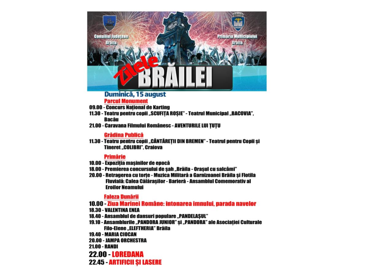 Duminică, 15 august, brăilenii vor putea participa la ora 09:00 în Parcul Monument la Concursul Național de Karting, la 11:30 la teatru pentru copii, la 21:00 la Caravana filmului românesc. În Grădina Publică, de la 11:30 se va juca ”Cântăreții din Bremen” - teatru pentru copii. La Primărie, începând cu ora 10:00 va avea loc expoziția mașinilor de epocă. La ora 18:00 premierea concusului de șah Brăila - oraș cu salcâmi. La ora 20:00 retragerea cu torțe - muzica militară a Garnizoanei Brăilă și Flotila Fluvială. Pe Faleza Dunării, de la 10:00 va avea loc sărbătorirea Zilei Marinei Române (intonarea imnului, parada navelor), iar după ora 18:00 vor urma spectacole. Mai exact, la 18:30 va urca pe scenă Valentina Enea, la 18:40 Ansmablul de dansuri populare ”Pandelașul”, la 19:10 Ansamblurile ”Pandora Junior” și ”Pandora” ale Asociației Culturale Filo-Elene ”Eleftheria” Brăila. De la ora 19:40 va concerta Maria Ciocan, de la 20:00 Jampa Orchestra, la ora 21:00 va urca pe scenă, Randi, iar la ora 22:00 va concerta Loredana. De la 22:35 seara va fi încheiată cu un show de artificii și lasere.