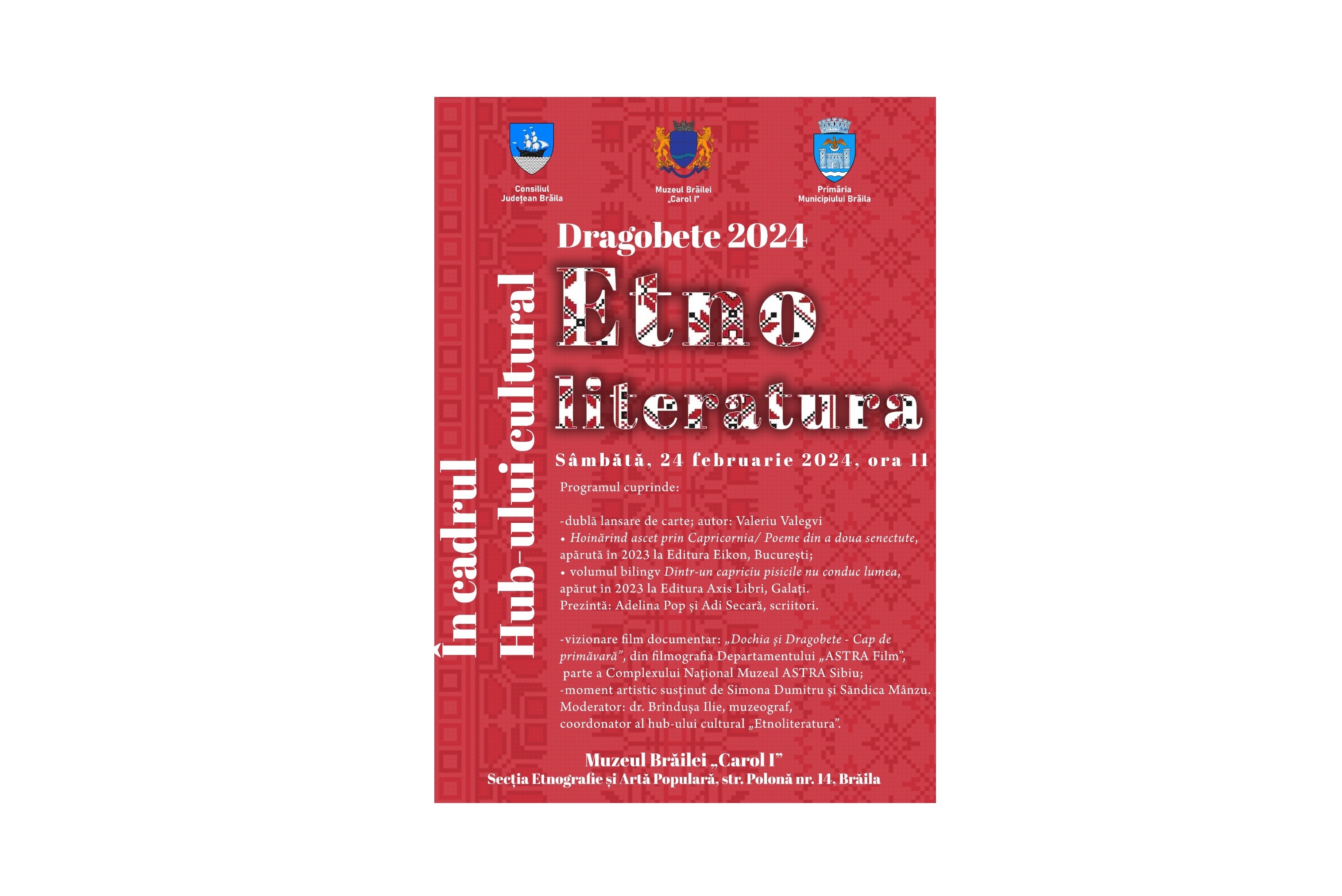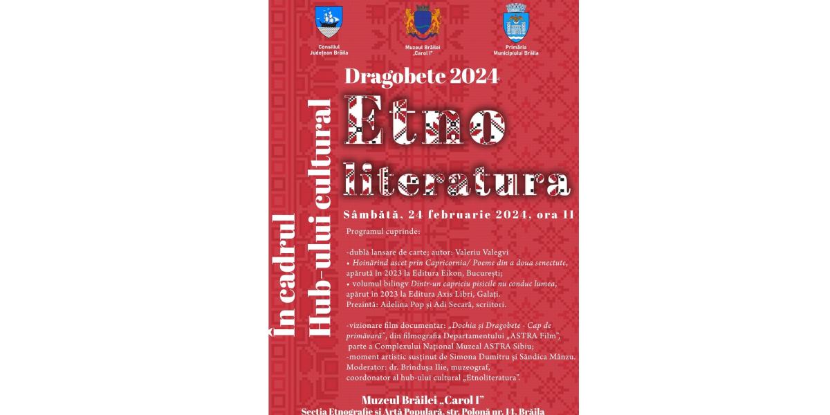 Secția Etnografie a Muzeului Brăilei „Carol I” organizează sâmbătă, 24 februarie, ora 11.00, de Dragobete, o nouă întâlnire în cadrul hub-ului cultural „Etnoliteratura”. Evenimentul va avea loc la sediul din Strada Polonă nr. 14 și va include o dublă lansare de carte (autor: Valeriu Valegvi), „Hoinărind ascet prin Capricornia / Poeme din a doua senectute” (apărută în anul 2023 la Editura Eikon, București) și volumul bilingv „Dintr-un capriciu pisicile nu conduc lumea” (apărut în același an la Editura Axis Libri, Galați). Prezintă: Adelina Pop și Adi Secară, scriitori.