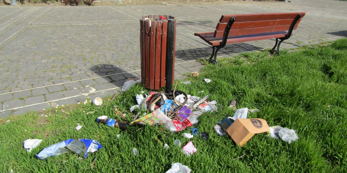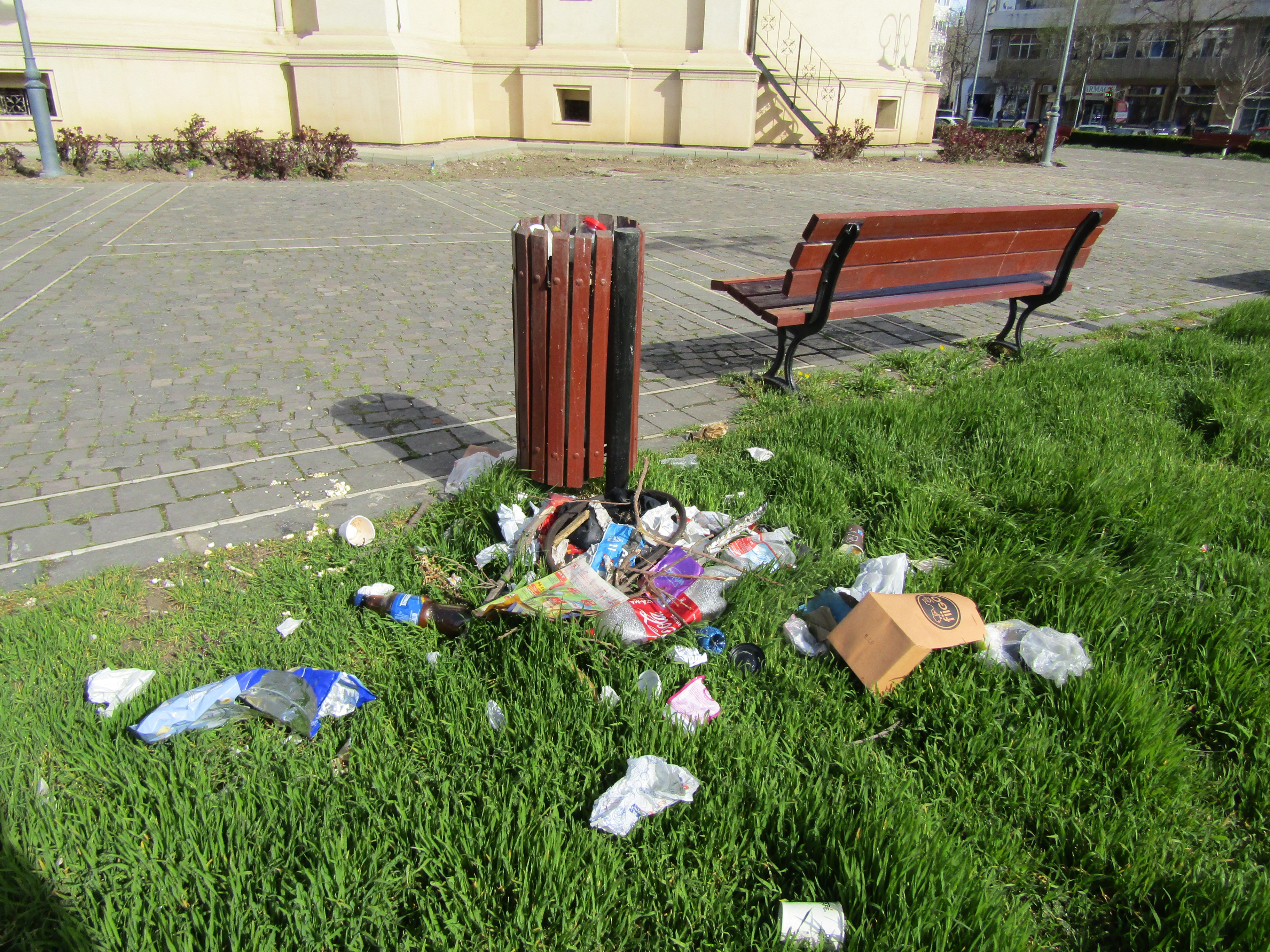 De mai bine de o săptămână, un coș de gunoi stă negolit și înconjurat de mizerie, lângă Catedrală. Este isprava unor nesimțiți și a găștilor care se adună seara aici, dar și a unor calici care “iau masa în oraș”, din pomenile primite. Iar la câțiva pași, se află, de foarte mult timp, vandalizată, o bancă.