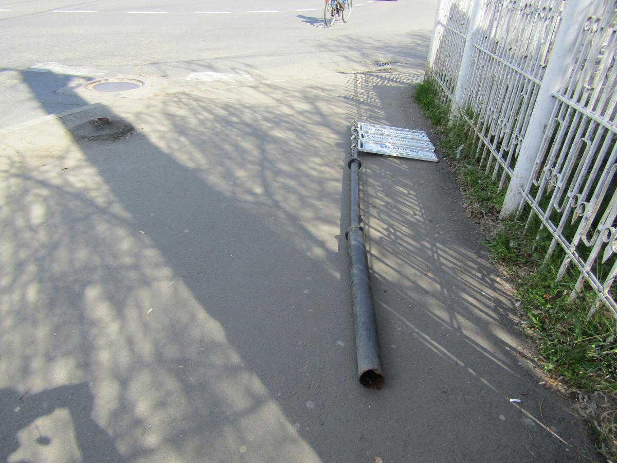 În altă zonă a orașului, mai exact în apropiere de sediul IMB, pe Șos. Vizirului, un indicator stradal zace pus la pământ de zile întregi. Pare-se că țeava de susținere a fost tăiată, că, vorba aia, “Indicatorul ăsta este numai bun de furat”... De fapt, astfel de indicatoare riscă să dispară nu doar din cauza unor accidente dar și a tehnologiei improprii de fixare pe trotuar: fără folosirea de carote și fără o hidroizolație corespunzătoare la bază, care să le dea rezistență în timp. Unde mai pui că țevile din care sunt făcuți stâlpii de susținere sunt cam subțiri ”în carne”, cum ar spune meseriașii. La felul impropriu cum sunt montate, apa își face loc ușor pe lângă țeavă, coroziunea acționează în voie, iar cine plantează aceste indicatoare, lasă uneori, în urmă, o pleașcă de beton lângă ele. După care, inconștient și de nimeni controlat, “Dorel” își șterge grăbit mistria pe negrul țevii. Ce să-i faci: “ noi muncim, nu gândim”...