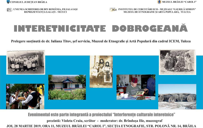Astăzi, 28 martie 2019, de la ora 11,00, la Secţia “Etnografie” a Muzeului Brăilei are loc prelegerea “Interetnicitate dobrogeană”, susţinută de dr. Iuliana Titov, şef serviciu la Muzeul de Etnografie şi Artă Populară din cadrul ICEM Tulcea.