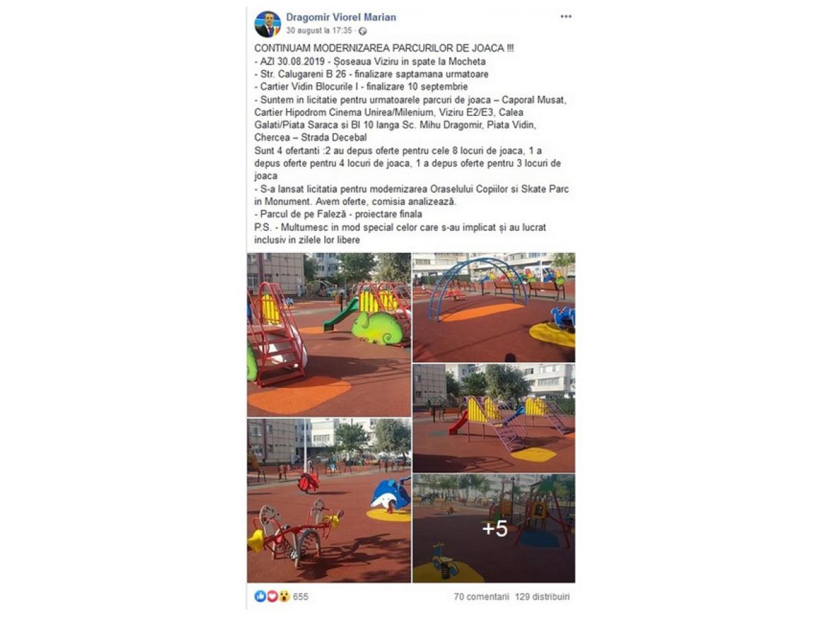 Precizăm că ulterior şedinţei ordinare din luna august, primarul Marian Dragomir a anunţat pe pagina sa de Facebook că modernizarea locurilor de joacă din oraş va continua, dând ca exemplu spaţiul din spatele fostului magazin “Mocheta”, amenajat de curând.