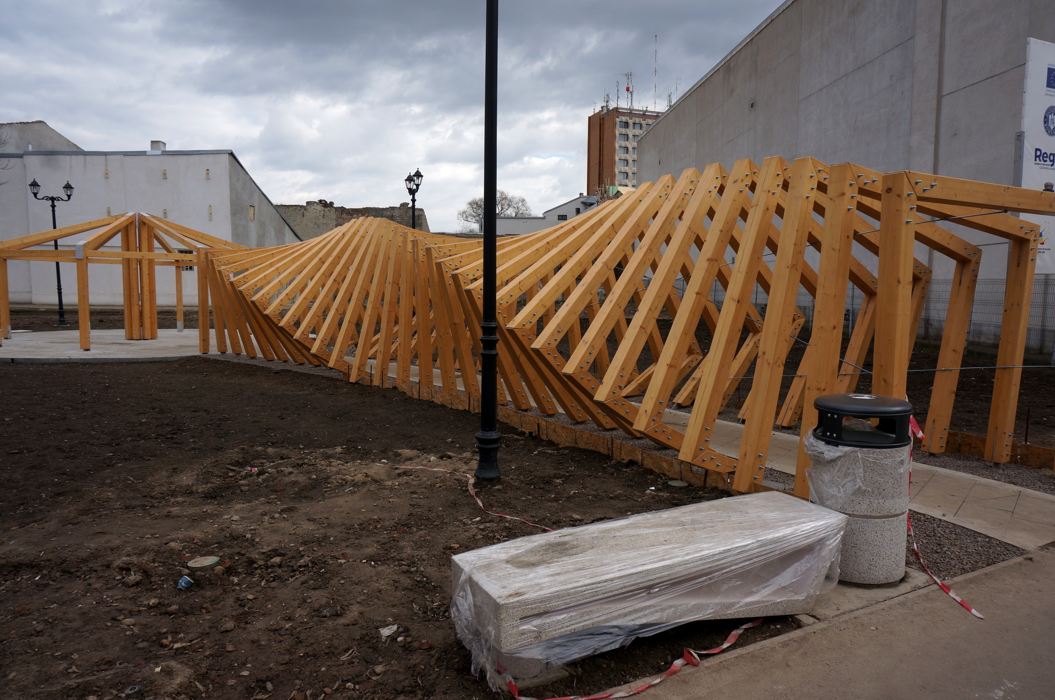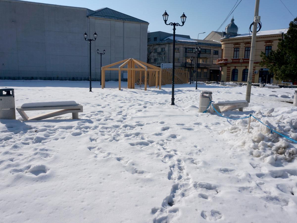 Amânări peste amânări pentru finalizarea proiectului de aproape 18 milioane de lei, ce prevede amenajarea a trei noi mini-parcuri în Centrul Vechi - printre care și cel din spatele Muzeului - și reabilitarea a trei străzi care asigură accesul la aceste parcuri. Firma ”Concivia” este constructorul angajat de Primărie, în urma unei licitații, pentru implementarea acestei investiții finanțate în proporție de circa 50% din fonduri europene, iar restul de la bugetul local. Când a semnat contractul de execuție, aceasta și-a asumat ca termen de finalizare data de 15 noiembrie 2022. La acea dată, însă, lucrările erau departe de a fi gata, chiar dacă cel mai vizibil front de lucru, cel de pe terenul de pe Calea Galați, din spatele Muzeului, începuse să prindă formă, apropiindu-se vag de ceea ce prezentau machetele arătate de Primărie când a demarat proiectul. Este vorba despre acel foișor din lemn, care inițial avea o formă rotunjită, ca de iglu, dar până la urmă a ieșit ceva țuguiat, ca un cort otoman... Pe lângă chioșcul de lemn, în mini-parcul din spatele Muzeului au fost schițate viitoarele alei și au fost amplasate, la sfârșitul anului trecut, câteva bănci din beton, cu un design destul de modern, precum și mai multe pubele tot dintr-un beton special, cu aspect plăcut. Toate aceste elemente de mobilier stradal au rămas, până la ora actuală, împachetate cu folia de plastic cu care au fost livrate de producător, în așteptarea momentului în care părculețul va fi, în sfârșit, finalizat și dat în exploatare. Așa le-a prins ninsoarea de la sfârșitul lui ianuarie, iar primii ghiocei ai primăverii le va găsi probabil cu foliile de plastic ceva mai rupte, dacă nu din cauza oamenilor atunci din cauza zăpezii, a vântului și a altor intemperii.