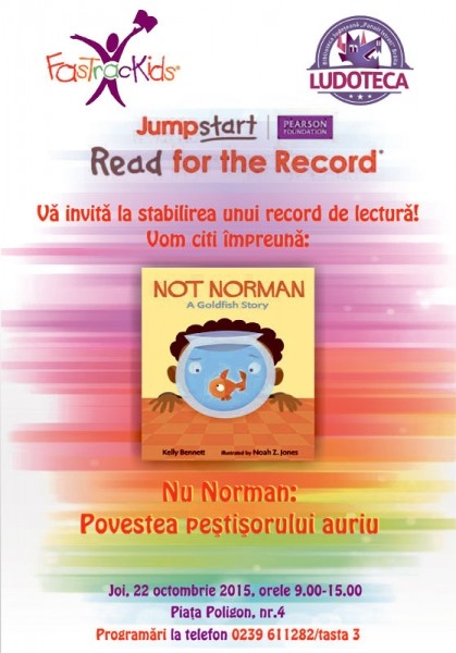 Biblioteca Judeţeană „Panait Istrati" în parteneriat cu FasTracKids Brăila organizează joi, 22 octombrie, între orele 9.00 - 15.00, evenimentul "Read for the Record" 2015. În cadrul acestui proiect se doreşte întâlnirea unui număr cât mai mare de copii cu vârste cuprinse între 3 şi 7 ani, cărora să le fie insuflată dragostea pentru lectură. Astfel, în ordinea programărilor făcute de către organizatori, sunt aşteptaţi la Secţia de Copii - Ludotecă grupuri de preşcolari sau şcolari clasele 0 şi 1, cărora li se va citi povestea "Nu, Norman: Povestea unui peştişor auriu" de Kelly Bennett.
