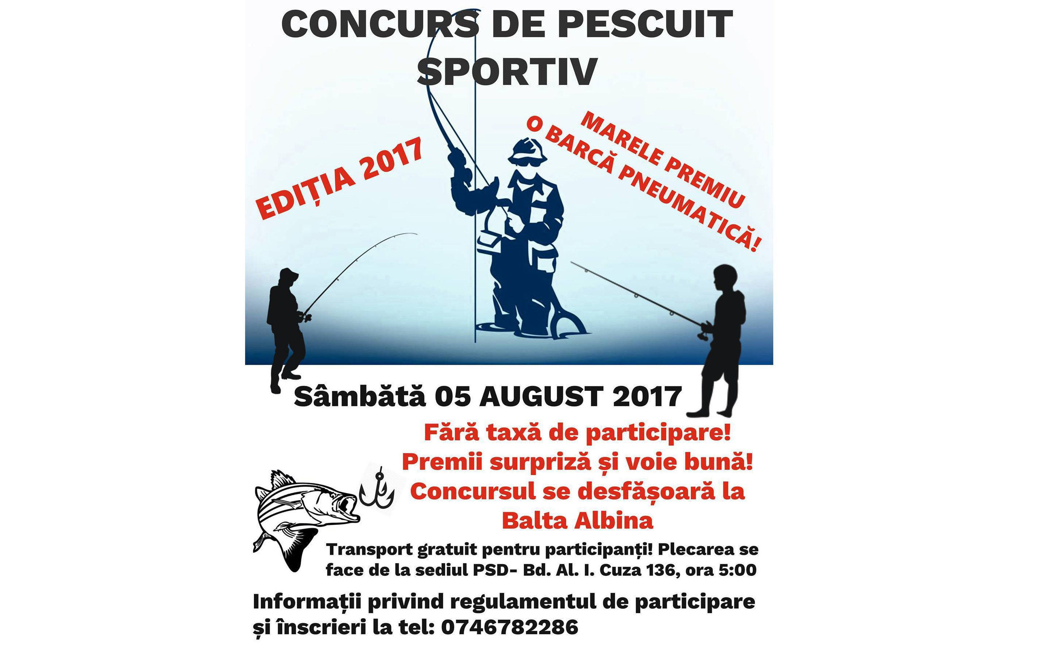 Pentru pescarii amatori de toate vârstele din Brăila urmează o nouă provocare, un concurs de pescuit la Balta Albina, programat sâmbătă, 5 august. Obiectivul principal al competiţiei este apropierea brăilenilor de natură şi reprezintă o alternativă de petrecere a timpului liber. Cei care vor concura se vor relaxa pe malul bălţii din localitatea Albina iar cei mai norocoşi dintre ei vor primi şi premii din partea organizatorilor. La Cupa PSD la pescuit, competiţie devenită deja tradiţională, ajunsă la cea de a VII-a ediţie, cei interesaţi să participe la acest concurs se pot înscrie până vineri, 4 august, ora 20.00, apelând numărul de telefon 0746 782 286. Concurenţii sunt aşteptaţi, sâmbătă dimineaţă, la ora 5.00, în faţa sediului PSD (Bulevardul Alexandru Ioan Cuza nr. 136). Organizatorii asigură transportul până la locul de desfăşurare a competiţiei.