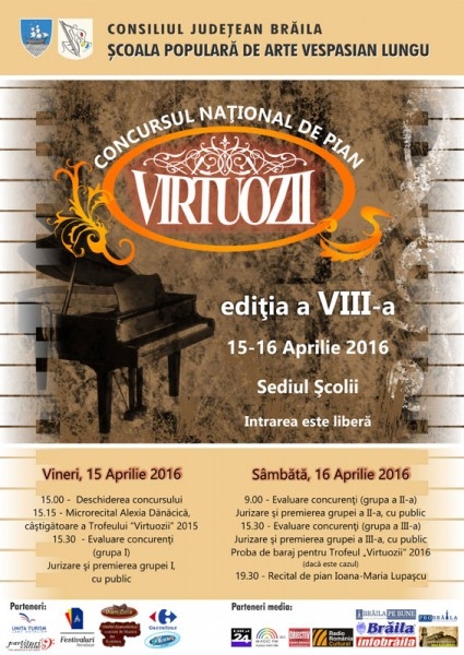 În perioada 15-16 aprilie, în Sala de festivităţi a Şcolii Populare de Arte "Vespasian Lungu" se va desfăşura cea de-a opta ediţie a Concursului Naţional de Pian "Virtuozii", concurs organizat de Şcoala Populară de Arte, cu sprijinul Consiliului Judeţean Brăila. La această ediţie vor participa aproximativ 120 de elevi care studiază pianul în cadrul şcolilor populare de artă, centrelor culturale, căminelor culturale, caselor de cultură, şcolilor şi liceelor cu profil vocaţional - pian, sistemului privat, această manifestare artistică fiind o modalitate de încurajare şi stimulare a copiilor şi tinerilor cu vârste cuprinse între 5 şi 16 ani.
