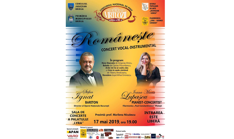 Vineri, 17 mai 2019, de la ora 19.00, la Sala de concerte a Palatului LYRA va avea loc concertul vocal-instrumental “Româneşte”, susţinut de Ioana Maria Lupaşcu, pianist-concertist la Filarmonica “Paul Constantinescu” din Ploieşti, şi de baritonul Ştefan Ignat, director al operei Naţionale Bucureşti. În program sunt lucrări ca: Hora Staccato, de Grigoraş Dinicu, Balada, de Ciprian Porumbescu, Cine m-aude cântând şi Arde-mi-te-ai codru des, de Tiberiu Brediceanu, Revedere, după Mihai Eminescu. Spectacolul va fi prezentat de profesor Marilena Niculescu, iar intrarea este liberă.