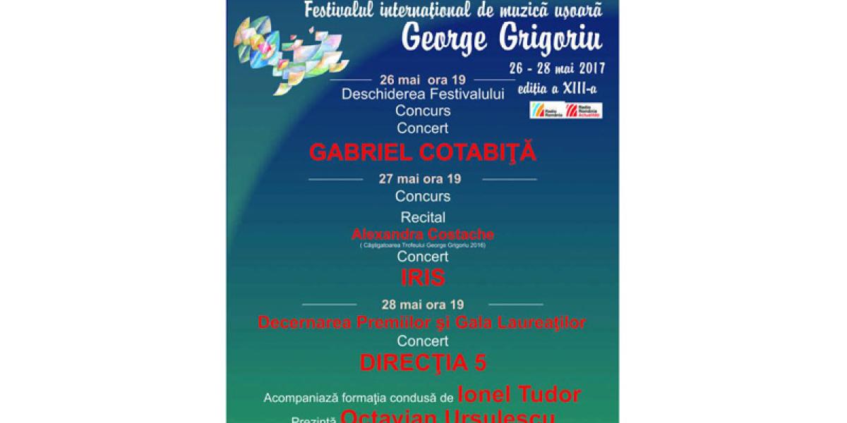 Anul acesta, Festivalul Internaţional de Muzică Uşoară “George Grigoriu”, ediţia a XIII-a, va avea loc la Teatrul “Maria Filotti”, între 26 şi 28 mai, cu începere de la ora 19:00 şi se va bucura de concerte de excepţie. Astfel, vineri, 26 mai, va urca pe scenă Gabriel Cotabiţă; sâmbătă, 27 mai, va concerta Iris şi în microrecital Alexandra Costache, câştigătoarea ediţiei 2016, iar duminică, 28 mai, când va avea loc decernarea premiilor şi gala laureaţilor, va concerta Direcţia 5. Ca de obicei, atât concurenţii, cât şi invitaţii care vor cânta în concerte pe durata festivalului vor fi acompaniaţi de formaţia condusă de Ionel Tudor, iar evenimentul va fi prezentat de Octavian Ursulescu. Manifestarea este organizată de Consiliul Judeţean Brăila-prin Centrul Judeţean pentru Conservarea şi Promovarea Culturii Brăila, cu sprijinul Primăriei Municipiului şi Teatrului “Maria Filotti”.