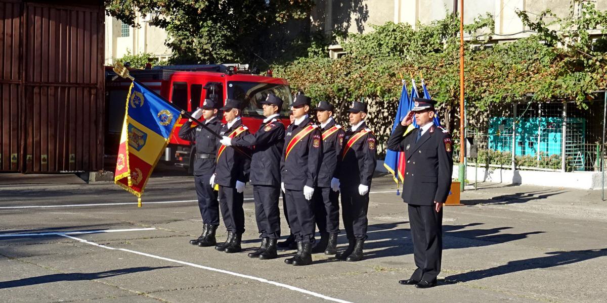 • spre deosebire de cel vechi, acesta poartă şi însemnele protecţiei civile, pe lângă cele ale pompierilor • drapelul i-a fost înmânat, pe 13 septembrie, inspectorului şef Cristian Ion de preşedintele Klaus Iohannis, într-o ceremonie desfăşurată la Bucureşti