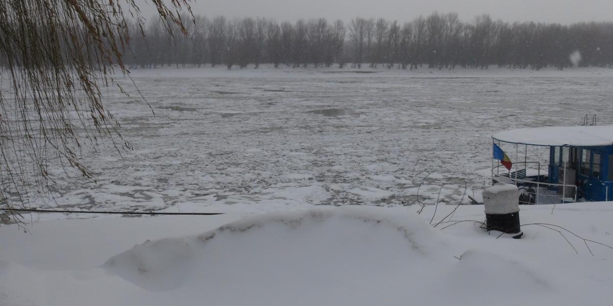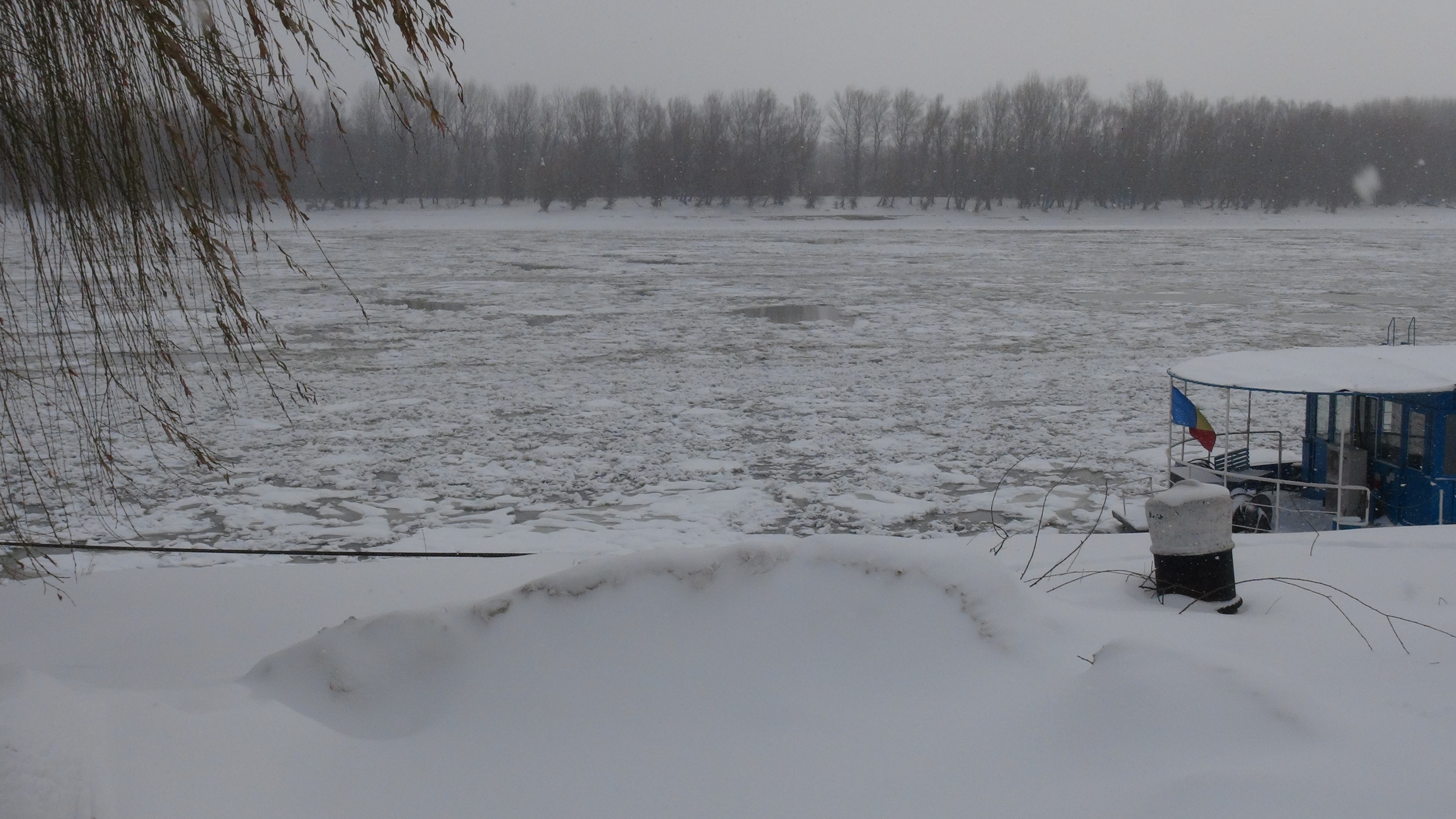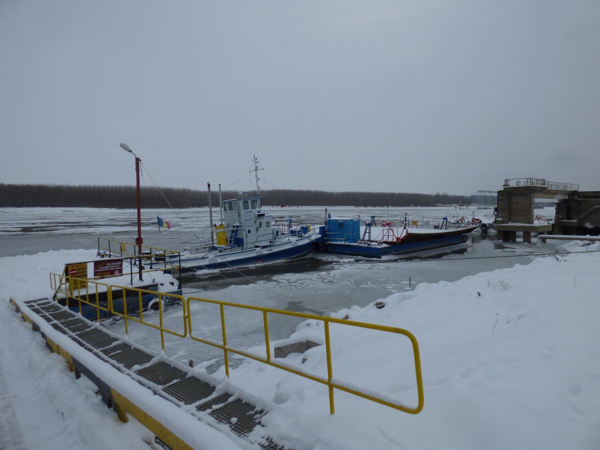 Accesul spre trecea bac IMB era pregătit, astăzi, ca la carte, în zona trecerii un utilaj terasier gata de intervenţie iar pe mal câteva maşini mici care aşteptau să treacă în Insulă. Alţi şoferi au făcut calea întoarsă, deoarece, din cauza sloiurilor foarte multe şi mari, era incert că se vor mai relua cursele cu bacul. În dreptul macaralei de pe cheul fostului PAL o mulţime de câini se repezeau spre stolurile de ciori venite să le fure din hrana dată de un bucureştean. De la care am aflat următoarele : „Stau aici de azi dimineaţă cu autoutilitara asta, pentru a lua 8 italieni veniţi de la începutul săptămânii, la vânat, în zona Frecăţei. I-a prins viscolul acolo şi tot aştept ca ei să treacă Dunărea, însă... Da, eu am venit azi dinspre Bucureşti, asfaltul era negru, pe la Buzău; ceva mai dificil a fost la Ianca. Dacă am văzut vreun bac? A trecut unul dimineaţă, cu un remorcher mare, pentru a traversa peste Dunăre două wolle şi o salvare. E vorba să desfunde drumul spre Frecăţei, dincolo de 20 km. Mai ştiu că a sunat şi ambasada italiană pentru cei veniţi la vânat şi că aici, la trecere, a fost şi prefectul Brăilei. Uite , s-a făcut ora două, şi stau şi-i tot aştept...”.