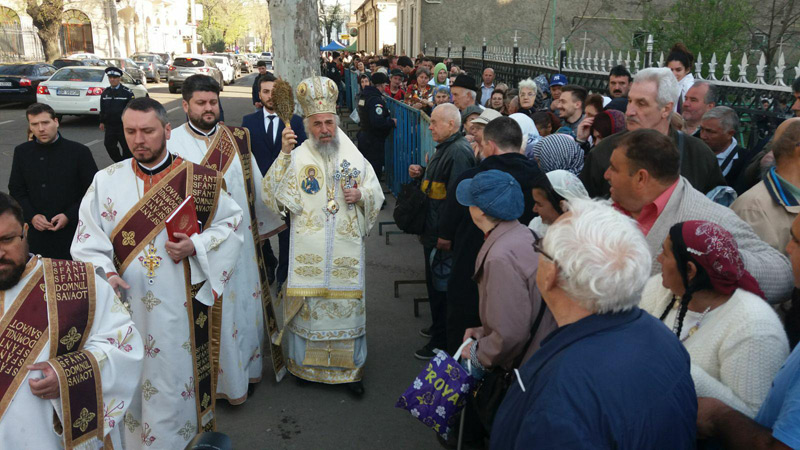 Însă puhoiul de lume a sosit abia joi noapte spre vineri, la Biserica Greacă. Deja, ieri, la ora 5 dimineaţă, erau peste 100 persoane între gardurile de protecţie ale jandarmilor. În jurul orei 10.00, coada se întindea pe câteva zeci de metri, ieşind din curtea lăcaşului sfânt. În numai o oră, aceeaşi coadă se întindea până pe strada Rubinelor, o străduţă lăturalnică din centru. Slujba începuse deja de vreo oră, când ÎPS Casian, Arhiepiscopul Dunării de Jos, a sosit la biserică. Până la ora 12.00, luaseră apă sfinţită vreo mie de persoane, iar alte o mie îşi aşteptau rândul. Până vineri noapte, erau estimaţi a veni încă 5-6.000 de pelerini, la Izvorul Tămăduirii.