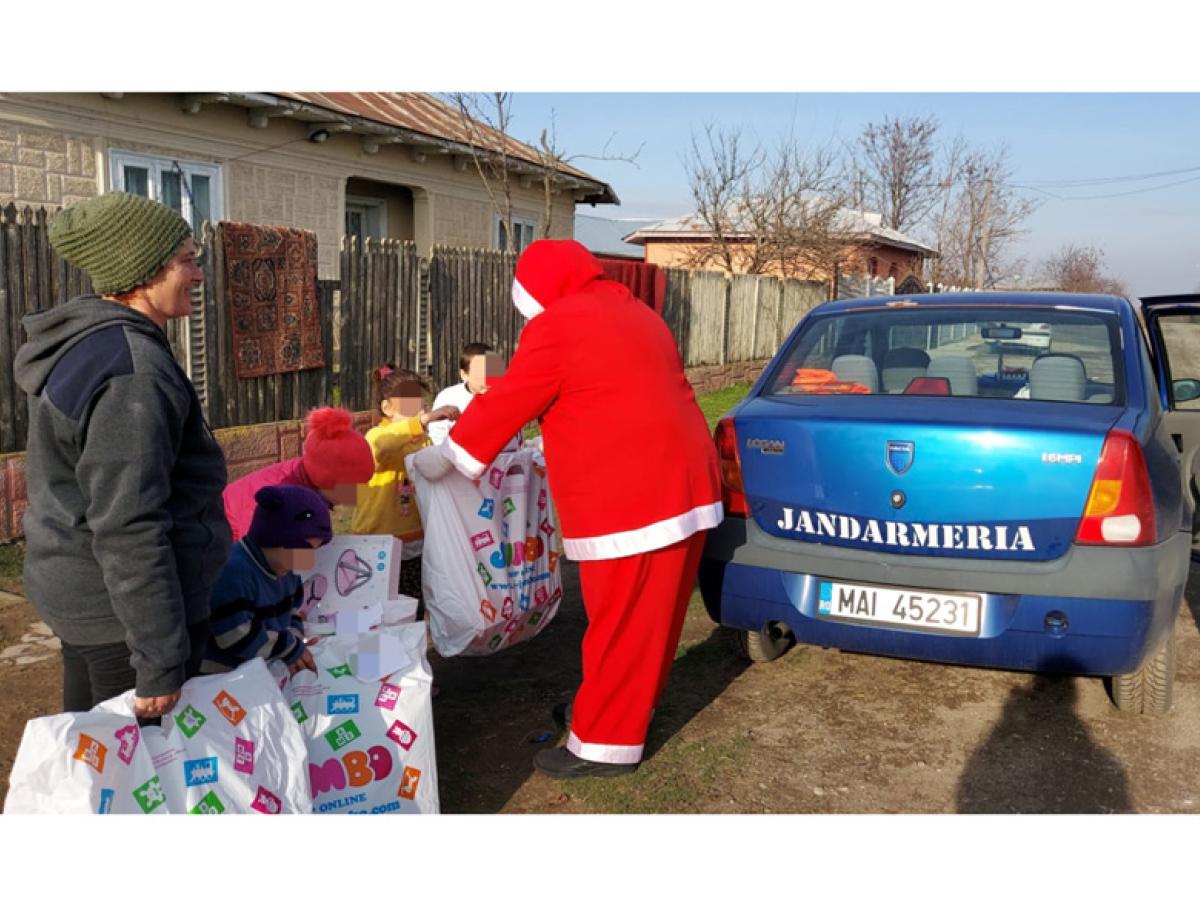 * jandarmii și-au asumat rolul de ajutoare ale Moșului cu barba albă și l-au ajutat pe Moș Crăciun să ducă la destinație mai multe cadouri pentru copii, cu duba * copiii au primit cu bucurie darurile oferite, iar un băiețel în vârstă de 10 ani a spus că și el vrea să devină jandarm