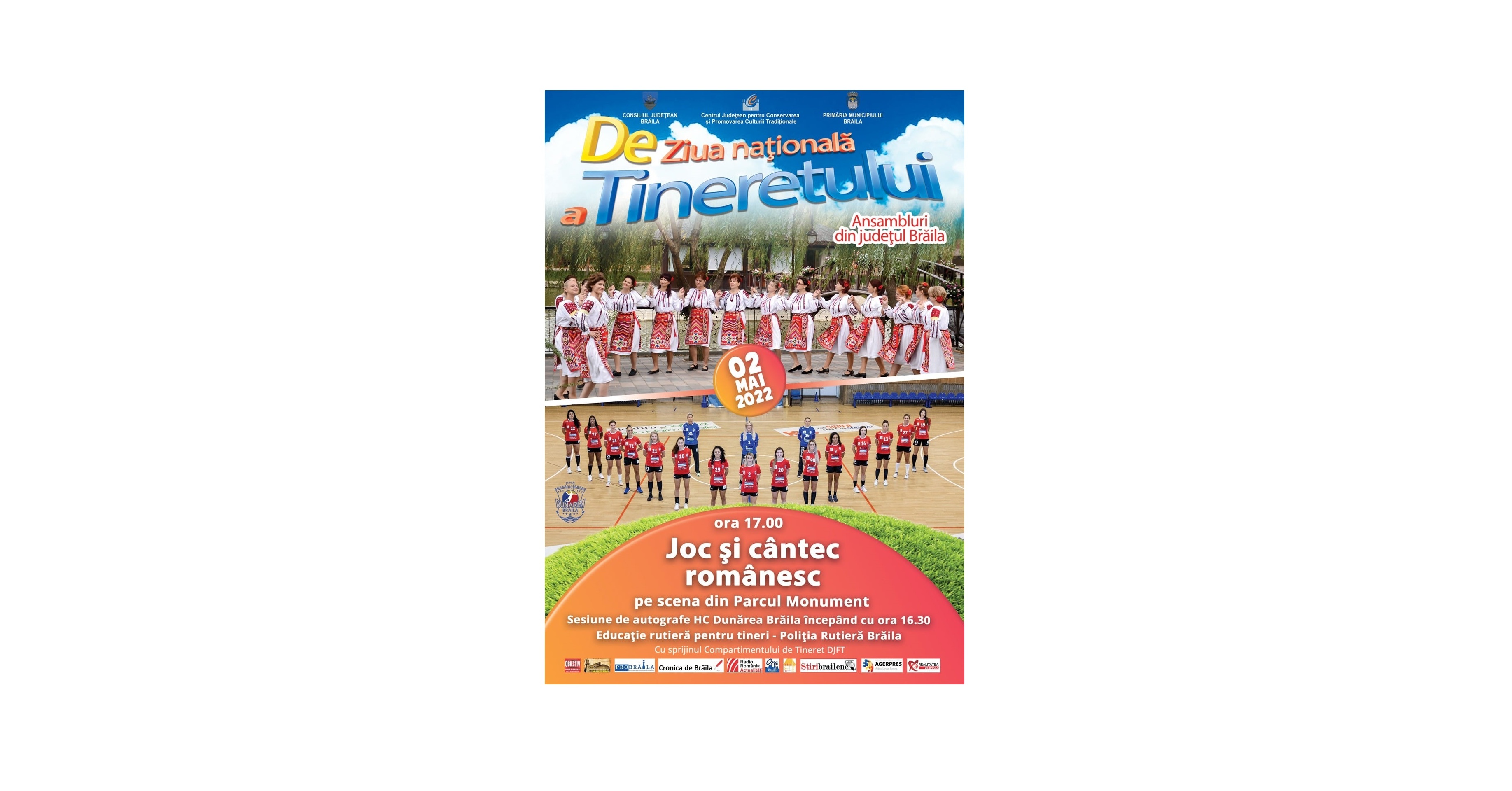 Astfel, potrivit comunicatului trimis de Centrul de Creație, Consiliul Județean Brăila, Primăria Municipiului și Centrul Județean pentru Conservarea și Promovarea Culturii Tradiționale Brăila, organizează în data de luni, 2 mai 2022, începând cu ora 17.00, pe scena din Parcul Monument, evenimentul cultural dedicat Zilei Naționale a Tineretului și intitulat "Joc și cântec românesc" - un eveniment artistic cu muzică, dans și voie bună - "prilej de celebrare a tinerei generații".
