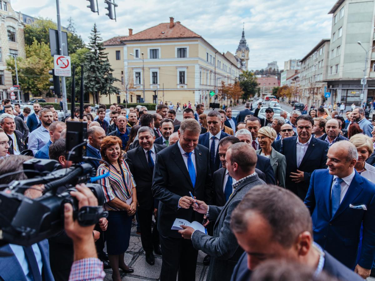 Preşedintele Klaus Ioahnnis a participat, luni dimineaţa, la festivitatea de deschidere a noului an universitar la Universitatea ”Babeş-Bolyai”, după care s-a deplasat câteva sute de metri pe jos, într-o adevărată baie de mulţime, oprindu-se frecvent pentru a se fotografia cu cei aflaţi în zonă. Ulterior, s-a deplasat de la Casa de Cultură a Studenţilor până în Piaţa Unirii, unde a urcat pe scenă şi le-a adresat câteva cuvinte studenţilor clujeni. Pe traseu, Klaus Iohannis, însoţit de un grup de studenţi, s-a oprit din nou pentru fotografii cu trecători care i-au solicitat acest lucru.