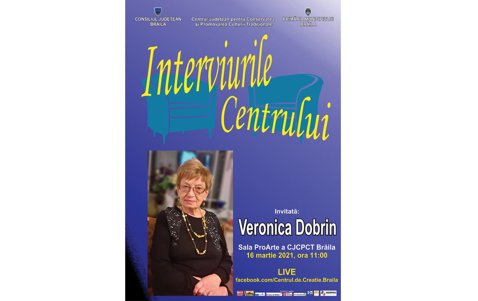 Evenimentul cultural „Interviurile Centrului” cu Veronica Dobrin va avea loc în Sala ProArte a Centrului Județean pentru Conservarea și Promovarea Culturii Tradiționale Brăila și va fi transmis live pe pagina de Facebook a organizatorului – Centrul.de.Creatie.Braila.